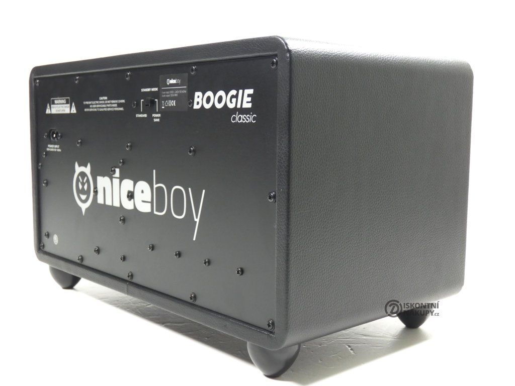 Reproduktor Niceboy BOOGIE zaujme na první pohled svým jedinečným designem s nádechem retra, který perfektně zapadne do každé místnosti. Je vhodný pro domácí použití, umí se totiž stát hvězdou každého večírku. Prostřednictvím integrovaných měničů s možností nastavitelné intenzity basů či výšek dokáže vynaložit silný a kvalitní zvuk s výkonem až 50 W. Na vrchní straně se nachází přehledný ovládací panel s konektory a potenciometry. Díky úspornému režimu přístroj nespotřebovává téměř žádnou energii.