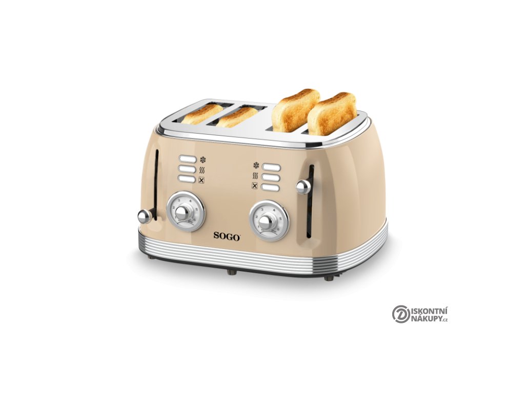 RETRO elegantní topinkovač na 4 toasty. Béžové retro provedení a vysoký výkon. Tlačítko pro zrušení uprostřed cyklu. Funkce automatického vyskakování. Rozmrazování chleba a funkce ohřevu. 2 elektronické regulace teploty na toast podle chuti - 6 úrovní. Vyjímatelná miska na drobky pro snadné čištění. Příkon: 1500 W