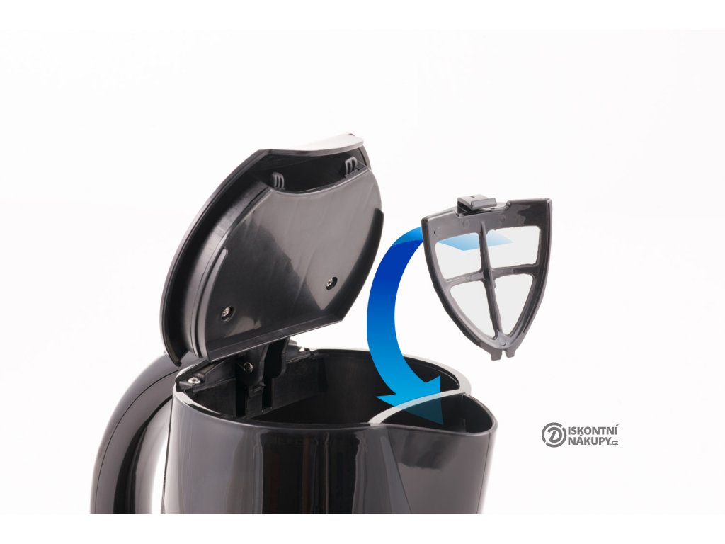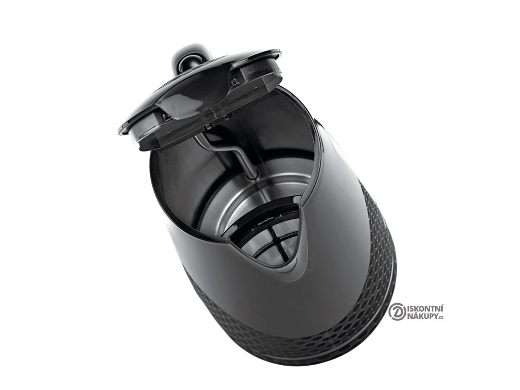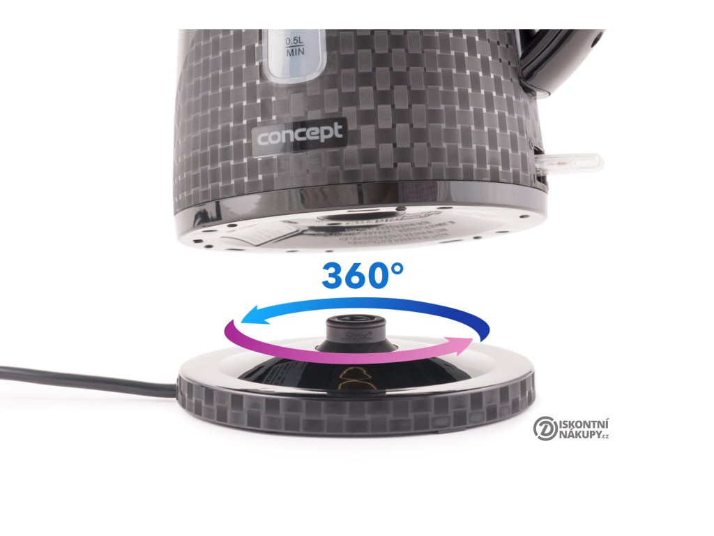 Široké tělo konvice, skryté topné těleso a vyjímatelné sítko proti vodnímu kameni umožňují snadné čištění. Výhodou je otočný podstavec o 360 st., takže nemusíte řešit, z jakého úhlu konvici na podstavec umístíte.