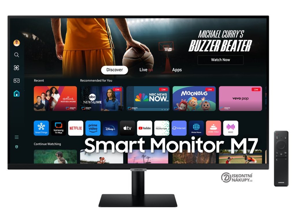 Samsung M7Chytrý LED monitor s úhlopříčkou 32" a rozlišením 3840 × 2160 bodů nabízí kontrastní poměr 3000 : 1, jas 300 cd/m2 a dobu odezvy 4 ms. Použitím technologie VA je dosaženo širokých pozorovacích úhlů 178° horizontálně i vertikálně. Monitor pohání operační systém Tizen, který umožňuje přístup k mnoha aplikacím pro sledování online obsahu, jako jsou Netflix, YouTube či Disney+, a to bez nutnosti zapínat počítač. Pro tyto účely je monitor vybaven bezdrátovým připojením Wi-Fi a Bluetooth. K dispozici jsou tři USB porty a jeden port USB-C, který kromě vysokorychlostního přenosu videa a dat umožňuje napájení připojených zařízení až do 65 W. Monitor podporuje také bezdrátové zrcadlení obrazovky z chytrého telefonu a službu DeX. Ozvučení zajišťují reproduktory s celkovým výkonem 10 W.