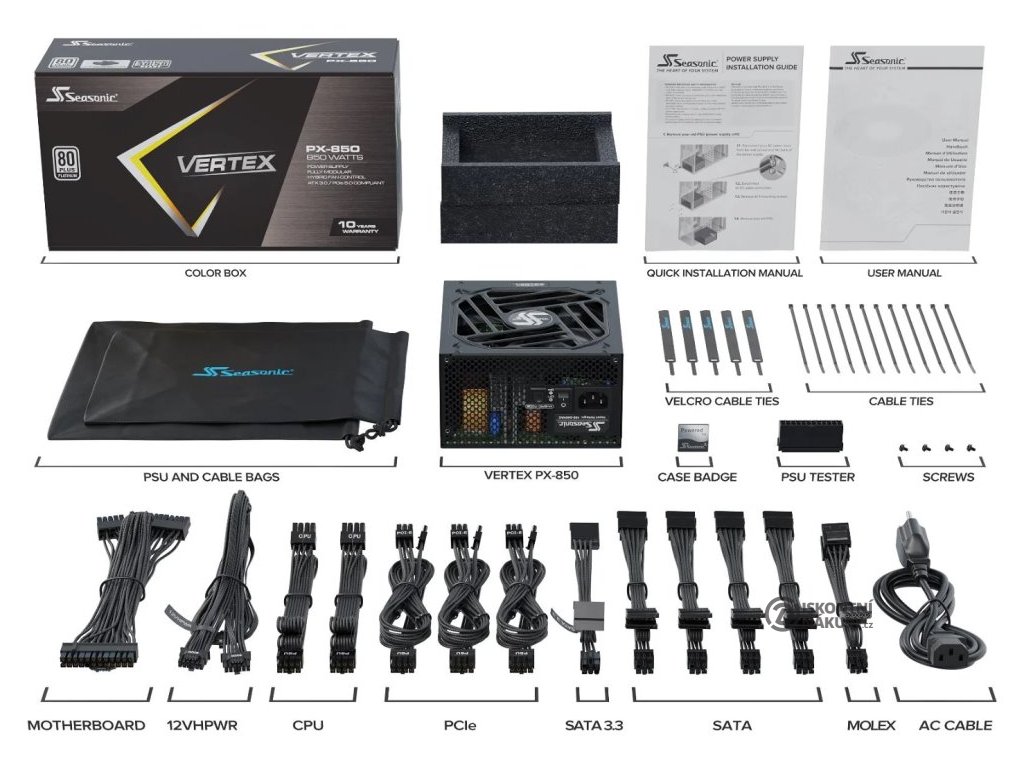 Seasonic VERTEX PX-850 Platinum 850 WNapájecí zdroj o výkonu 850 W je osazen tichým a přitom výkonným 135mm ventilátorem. Zdroj splňuje certifikaci 80PLUS Platinum, standard ATX 3.0 a má plně odpojitelné kabely.