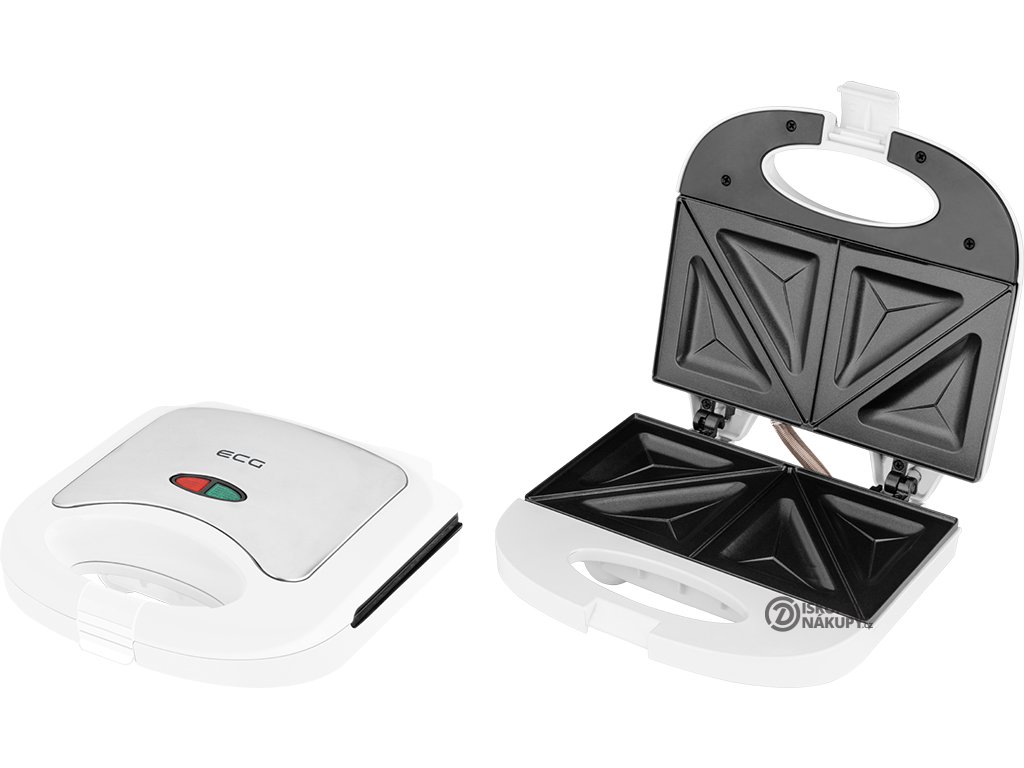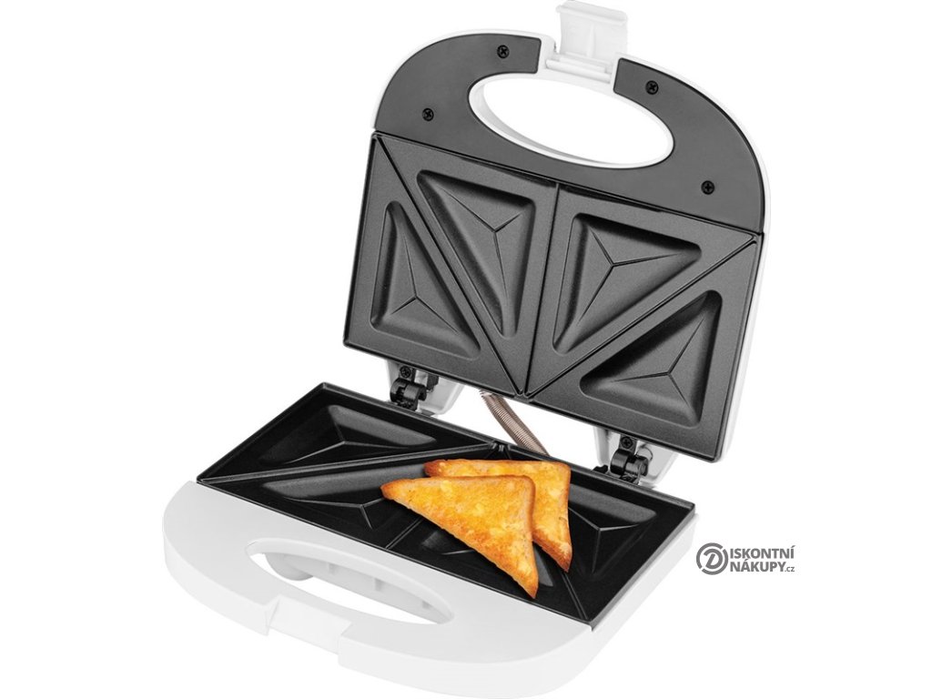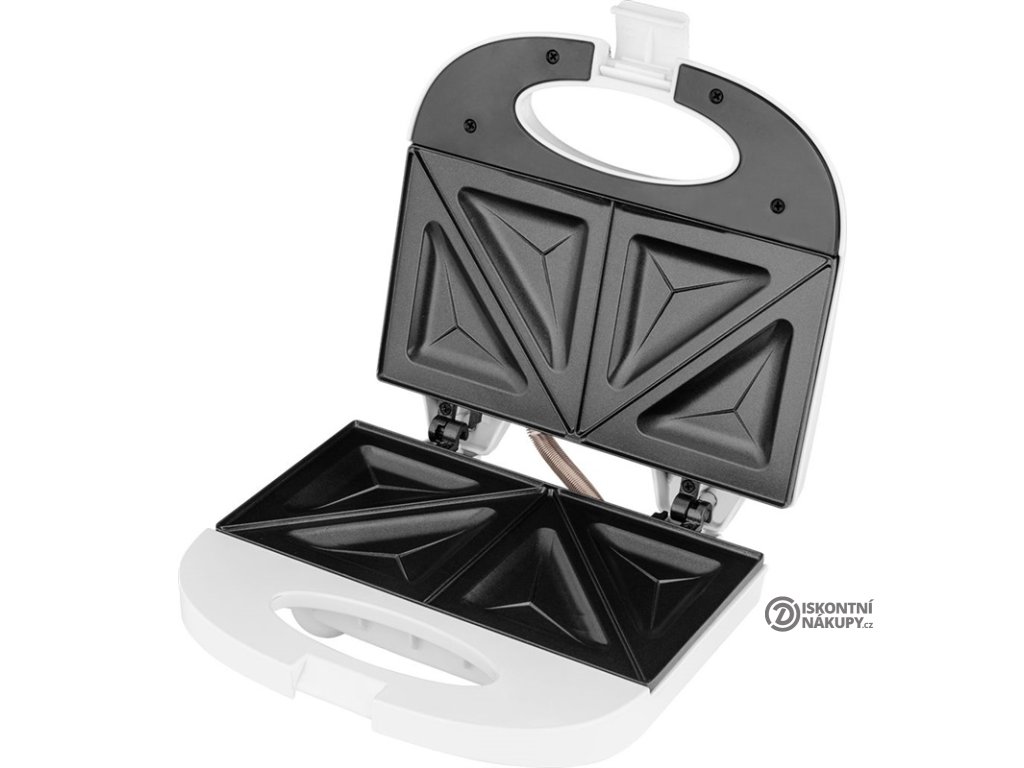 pro přípravu 4 trojúhelníčkových sendvičů, bílá barva v kombinaci s nerezí, nepřilnavá povrchová úprava pečících ploch, tepelně izolovaná rukojeť, indikátor připojení k síťové zásuvce / připravenosti k pečení, příkon 750 W