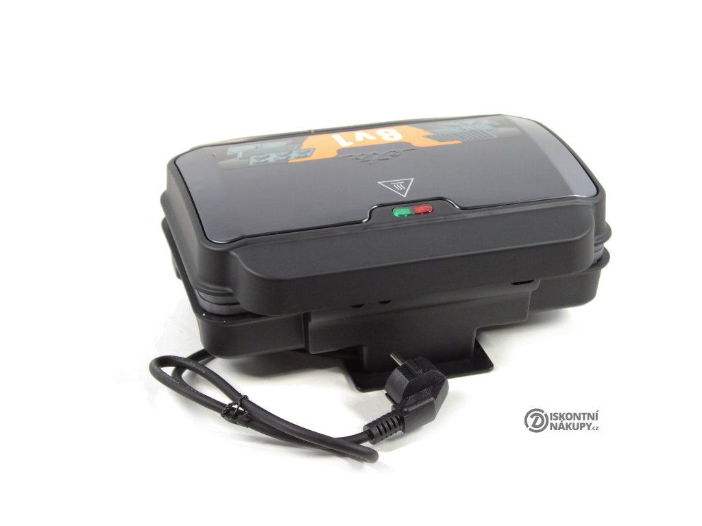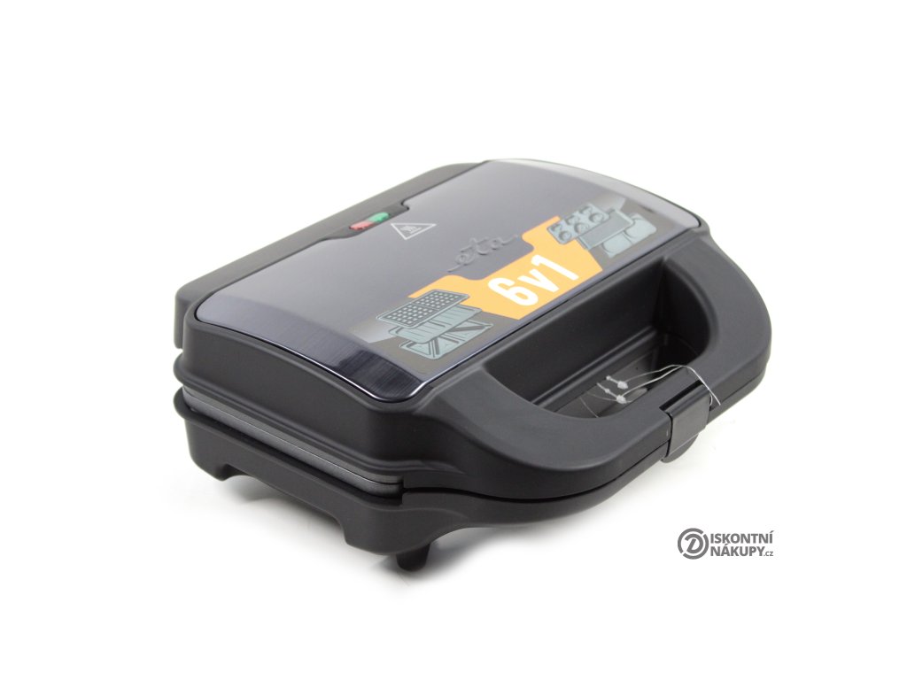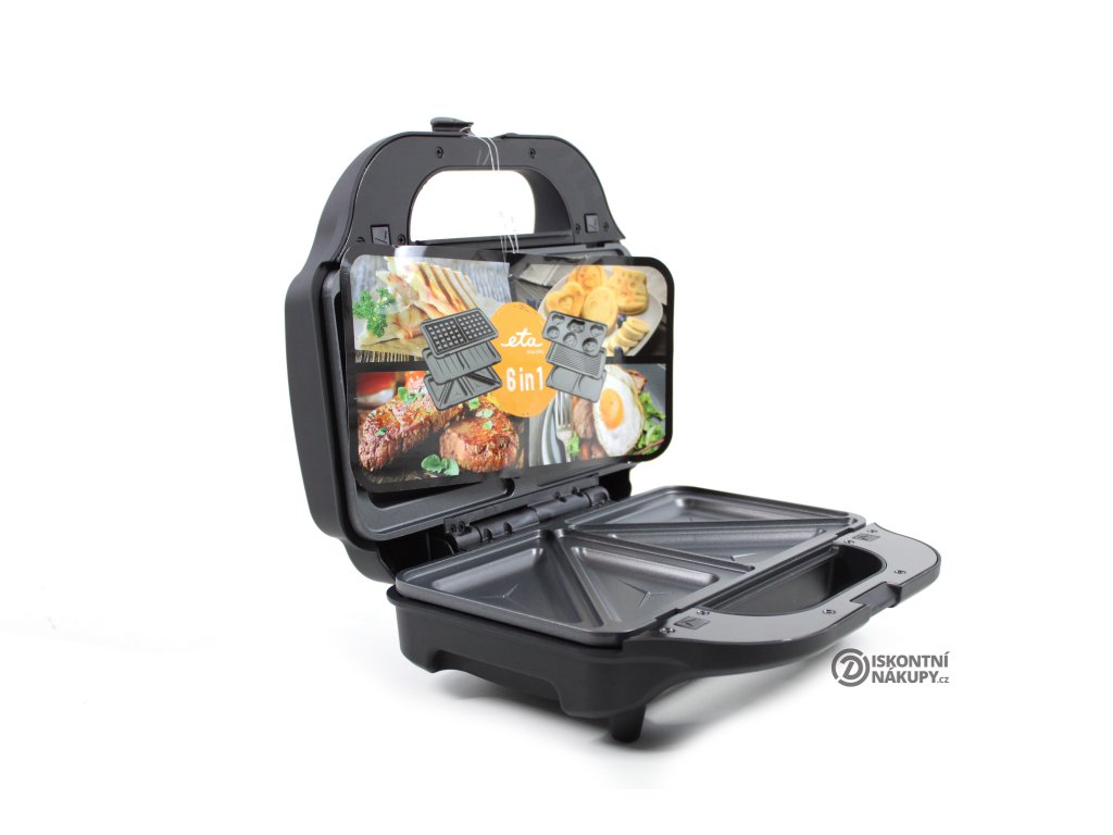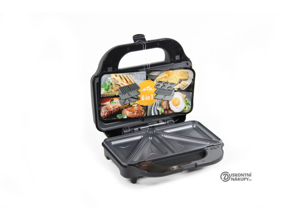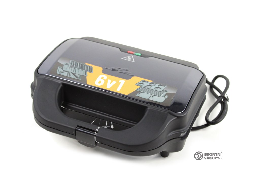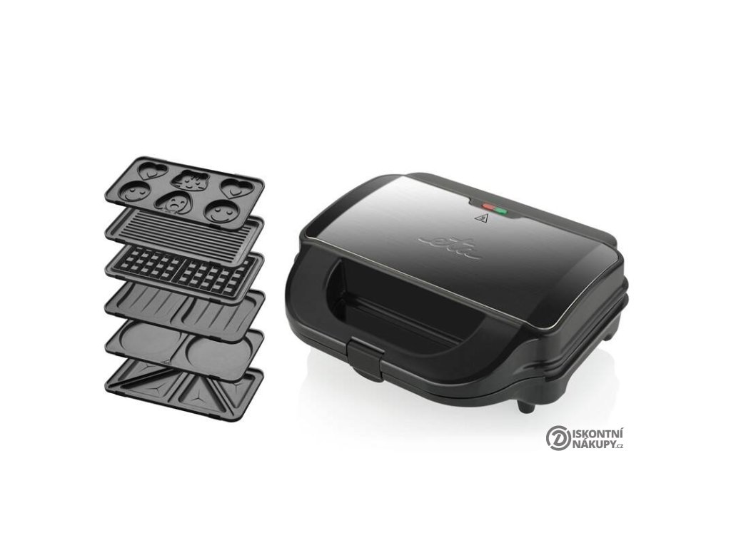 sendvičovač 6 v 1• příkon 900 W • připravíte toasty, vafle, panini, lívance, koláčky pro děti a grilované pokrmy • antiadhezní úprava • automatická regulace teploty • 11 výměnných desek • 11,5 × 29,5 × 25,5 cm