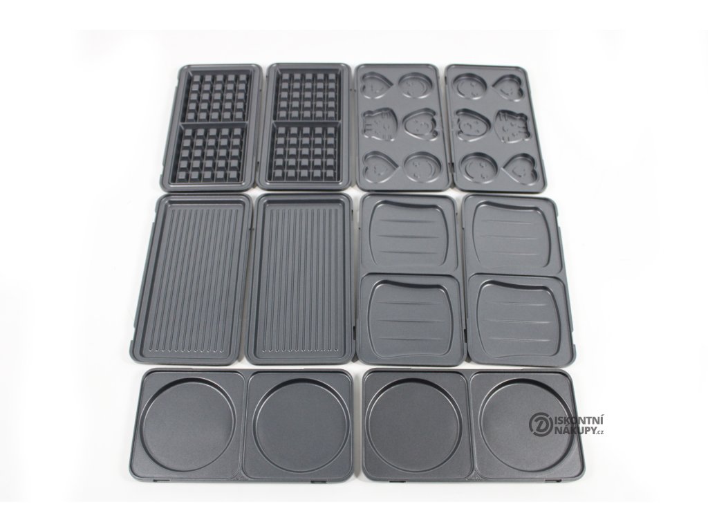 Přístroj je dodáván s 11 výměnnými deskami, které vám umožní připravit nejrůznější typy pokrmů. Kromě klasických trojúhelníkových toustů vytvoříte například vafle, panini, lívance a koláčky pro děti. Můžete jej použít také jako kompaktní domácí gril.