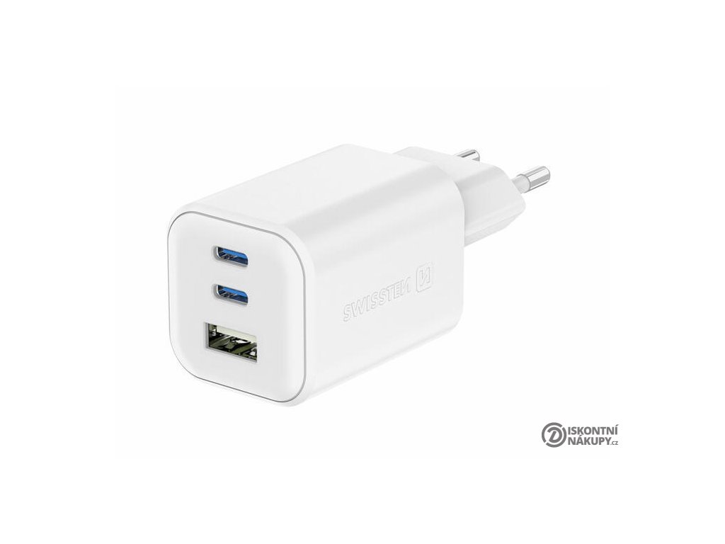 SÍŤOVÝ ADAPTÉR SWISSTEN GaN 2x USB-C 65W PD + 1x USB-A 18W QC BÍLÝ ..Nové zboží
