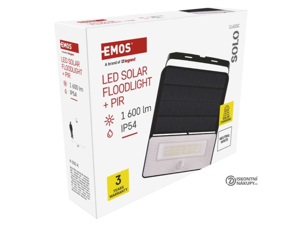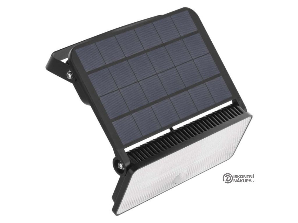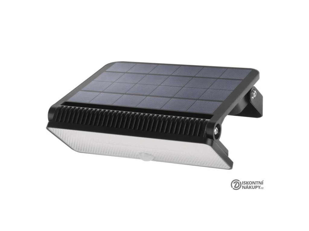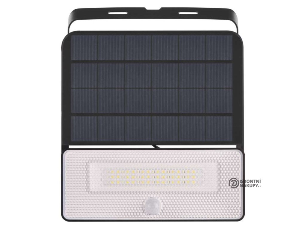 akumulátor: Li-Ion 3 600 mAh|barva: černá|barva světla: neutrální bílá|délka přívodního kabelu: neuvádí se|doba svícení na AKU: neuvádí se|dosah PIR senzoru: 6 m|energetická třída použitého světelného zdroje: neuvádí se|flicker-free: nebliká|frekvence: neuvádí se|index podání barev (CRI): Ra > 80|kategorie: CLASSIC|krytí: IP54|materiál difuzoru: plast (PC)|materiál přívodního kabelu: neuvádí se|materiál těla: plast (ABS+PC)|napájení: solární|napětí: 3,7 V|PIR senzor: ano|počet průchozích zásuvek: neuvádí se|použití: povrchová montáž|příkon: –|prodejní obal: 1 ks, krabice|proud: neuvádí se|řada: neuvádí se|rozměr: 190 × 184 × 28 mm|rozsah pracovní teploty: -10 °C až +40 °C|stmívání: neuvádí se|stupeň ochrany proti mechanickým nárazům: neuvádí se|světelná účinnost: neuvádí se|světelný tok: 1 600 lm|teplota chromatičnosti: 4 000 K|typ přívodního kabelu: neuvádí se|typ průchozích zásuvek: neuvádí se|typ stmívání: –|účiník: neuvádí se|úhel vyzařování: 100°|záruční doba: 3 roky|zdroj světla: LED|životnost: neuvádí se|zkušební žárovka součástí balení: neDoplňkové parametry