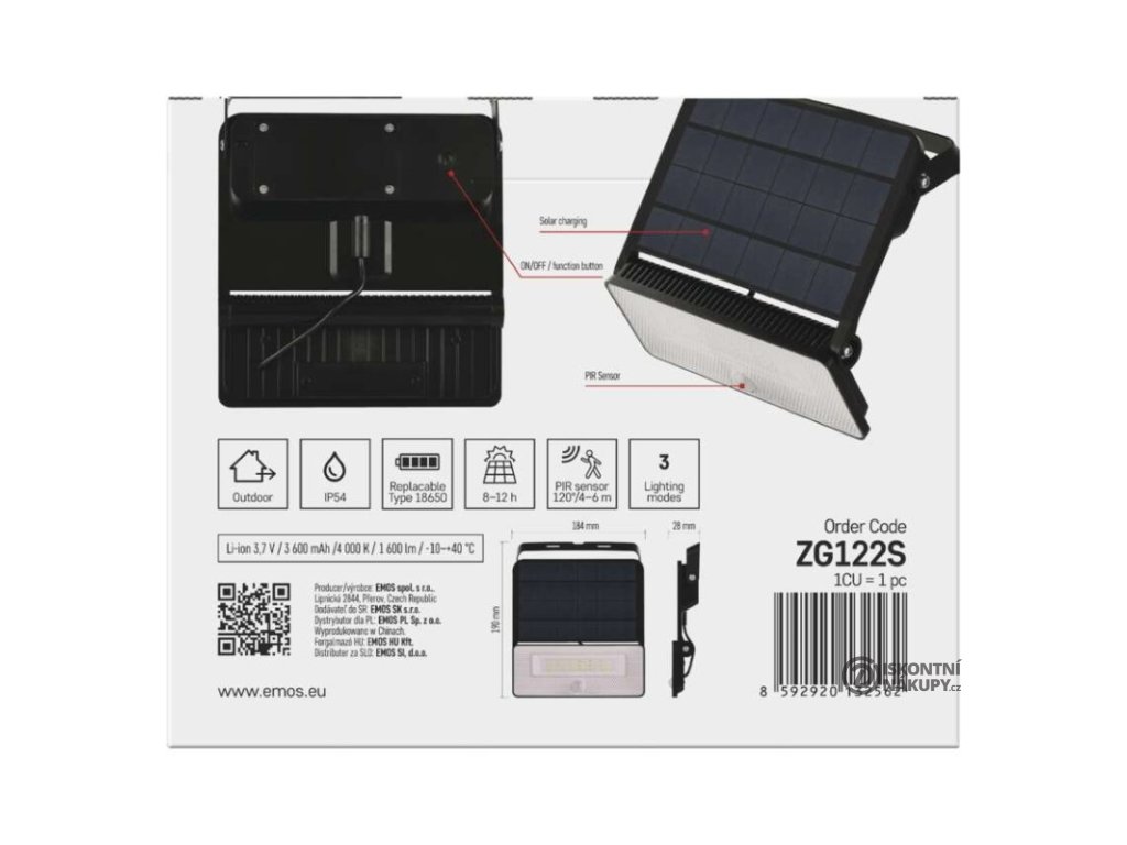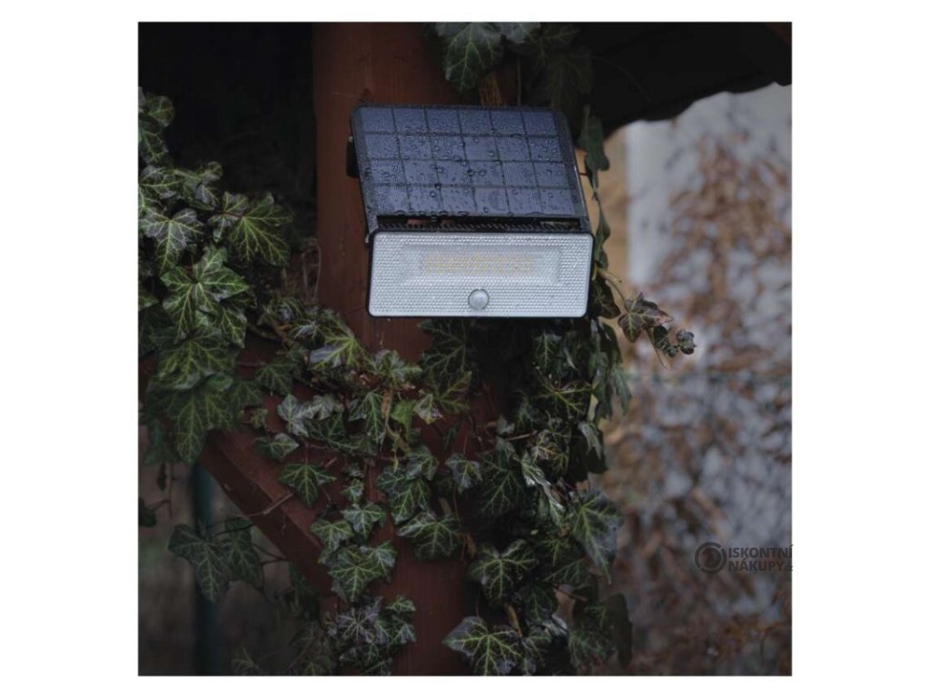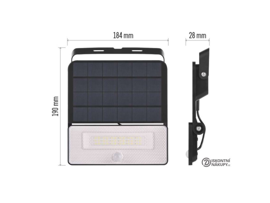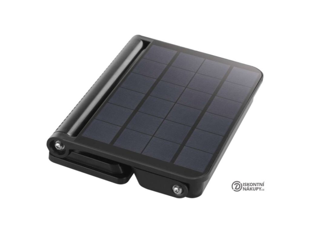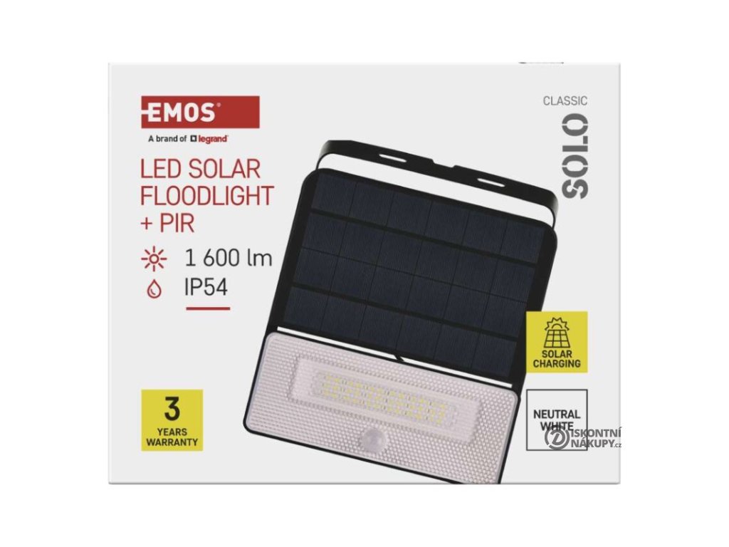 akumulátor: Li-Ion 3 600 mAh|barva: černá|barva světla: neutrální bílá|délka přívodního kabelu: neuvádí se|doba svícení na AKU: neuvádí se|dosah PIR senzoru: 6 m|energetická třída použitého světelného zdroje: neuvádí se|flicker-free: nebliká|frekvence: neuvádí se|index podání barev (CRI): Ra > 80|kategorie: CLASSIC|krytí: IP54|materiál difuzoru: plast (PC)|materiál přívodního kabelu: neuvádí se|materiál těla: plast (ABS+PC)|napájení: solární|napětí: 3,7 V|PIR senzor: ano|počet průchozích zásuvek: neuvádí se|použití: povrchová montáž|příkon: –|prodejní obal: 1 ks, krabice|proud: neuvádí se|řada: neuvádí se|rozměr: 190 × 184 × 28 mm|rozsah pracovní teploty: -10 °C až +40 °C|stmívání: neuvádí se|stupeň ochrany proti mechanickým nárazům: neuvádí se|světelná účinnost: neuvádí se|světelný tok: 1 600 lm|teplota chromatičnosti: 4 000 K|typ přívodního kabelu: neuvádí se|typ průchozích zásuvek: neuvádí se|typ stmívání: –|účiník: neuvádí se|úhel vyzařování: 100°|záruční doba: 3 roky|zdroj světla: LED|životnost: neuvádí se|zkušební žárovka součástí balení: neDoplňkové parametry