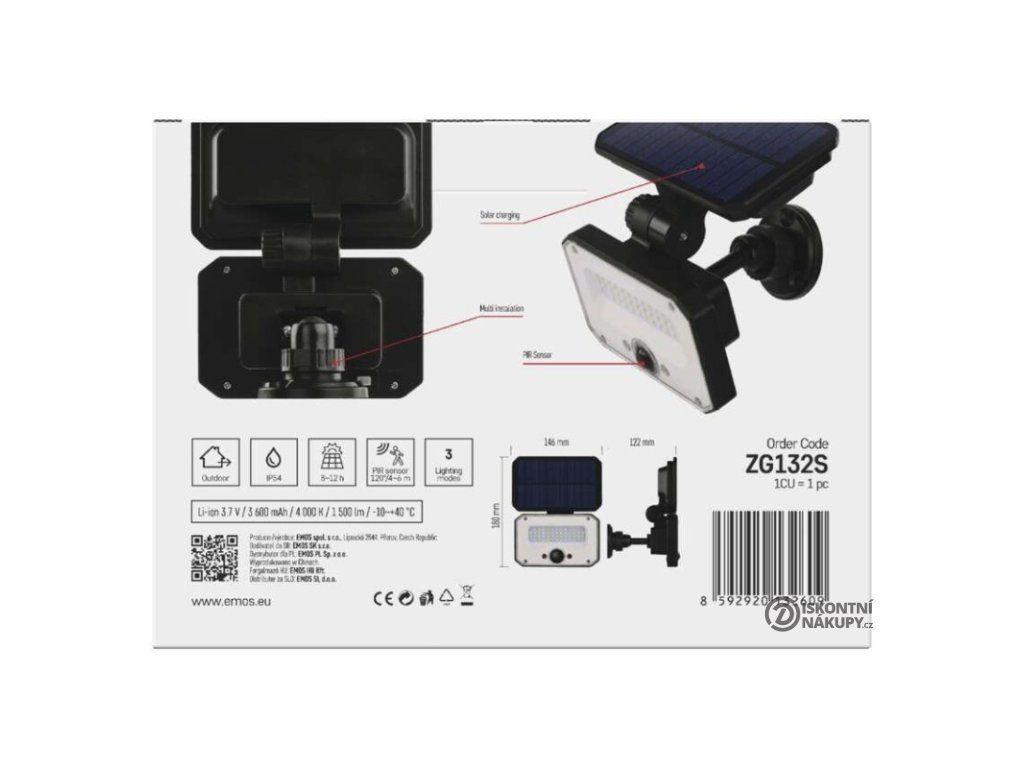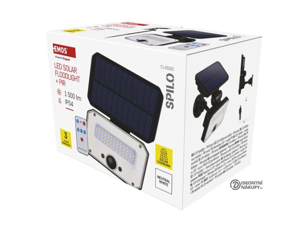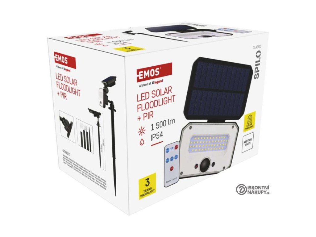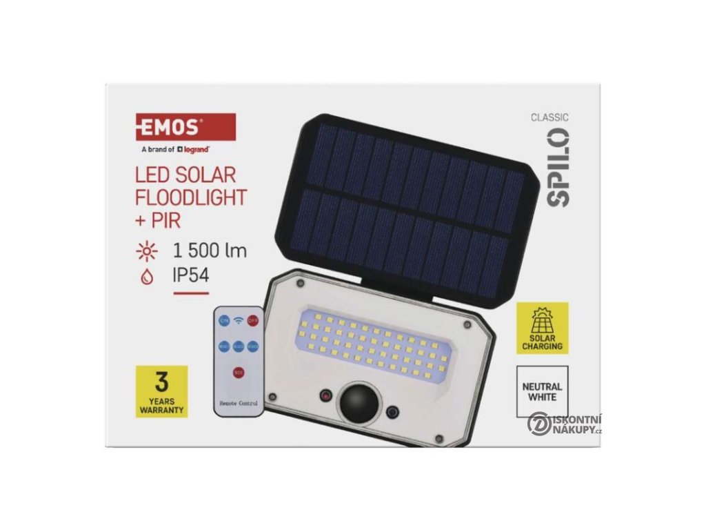 akumulátor: Li-Ion 3 600 mAh|barva: černá|barva světla: neutrální bílá|délka přívodního kabelu: neuvádí se|doba svícení na AKU: neuvádí se|dosah PIR senzoru: 6 m|energetická třída použitého světelného zdroje: neuvádí se|flicker-free: nebliká|frekvence: neuvádí se|index podání barev (CRI): Ra > 80|kategorie: CLASSIC|krytí: IP54|materiál difuzoru: plast (PC)|materiál přívodního kabelu: neuvádí se|materiál těla: plast (ABS+PC)|napájení: solární|napětí: 3,7 V|PIR senzor: ano|počet průchozích zásuvek: neuvádí se|použití: povrchová montáž|příkon: –|prodejní obal: 1 ks, krabice|proud: neuvádí se|řada: neuvádí se|rozměr: 180 × 146 × 122 mm|rozsah pracovní teploty: -10 °C až +40 °C|stmívání: neuvádí se|stupeň ochrany proti mechanickým nárazům: neuvádí se|světelná účinnost: neuvádí se|světelný tok: 1 500 lm|teplota chromatičnosti: 4 000 K|typ přívodního kabelu: neuvádí se|typ průchozích zásuvek: neuvádí se|typ stmívání: –|účiník: neuvádí se|úhel vyzařování: 110°|záruční doba: 3 roky|zdroj světla: LED|životnost: neuvádí se|zkušební žárovka součástí balení: neDoplňkové parametry