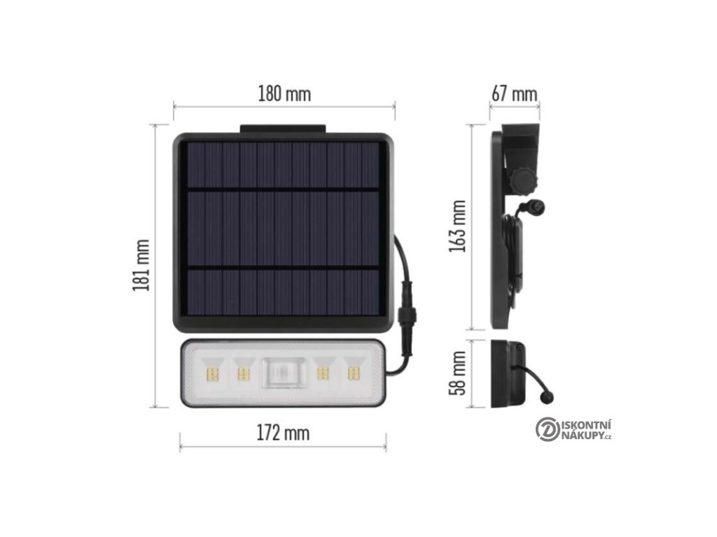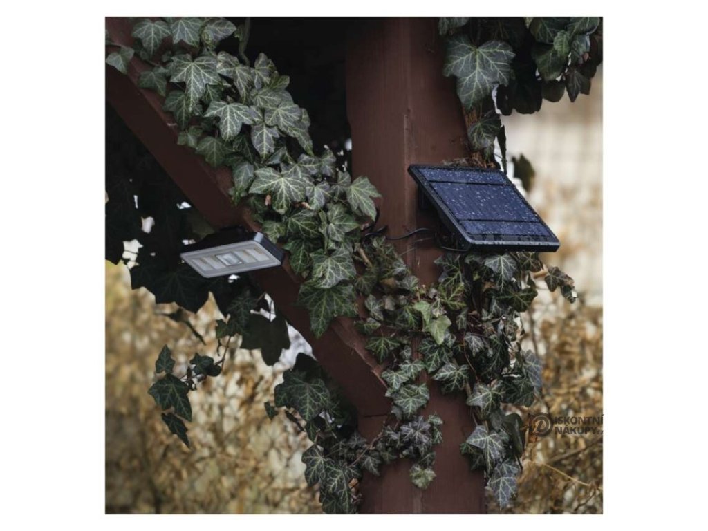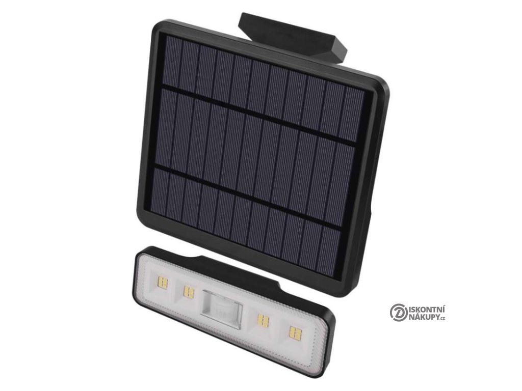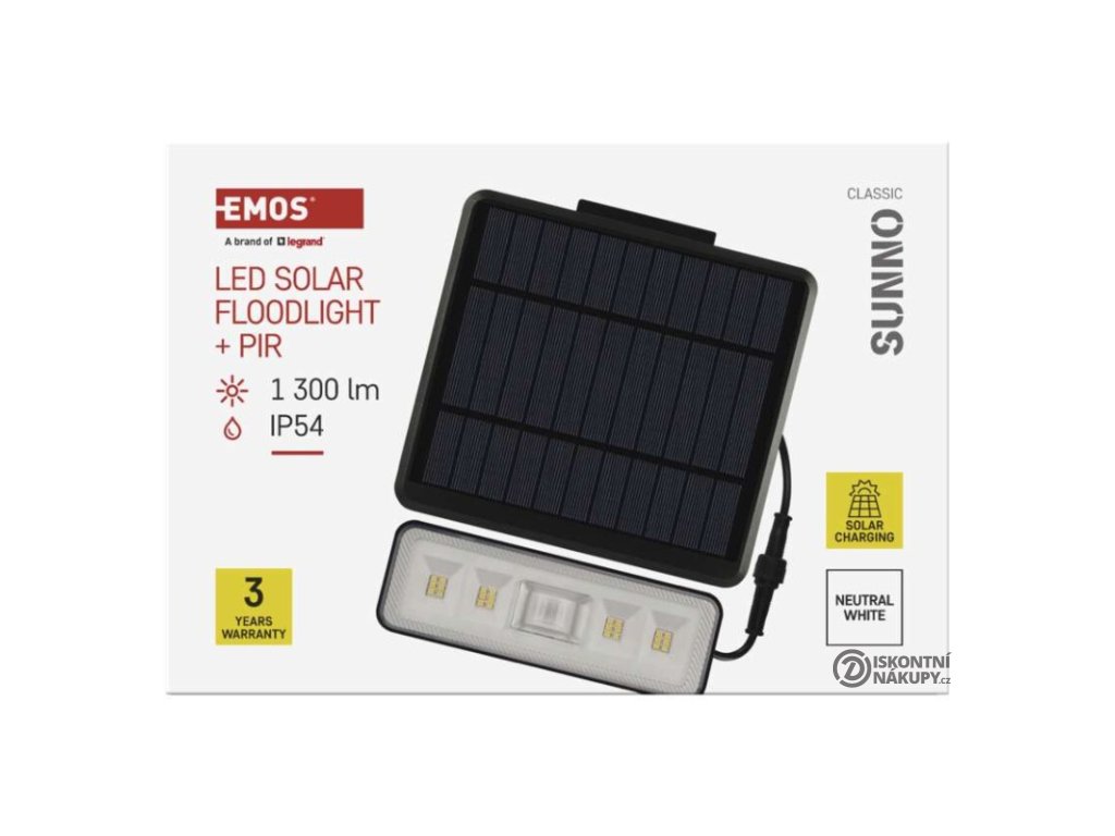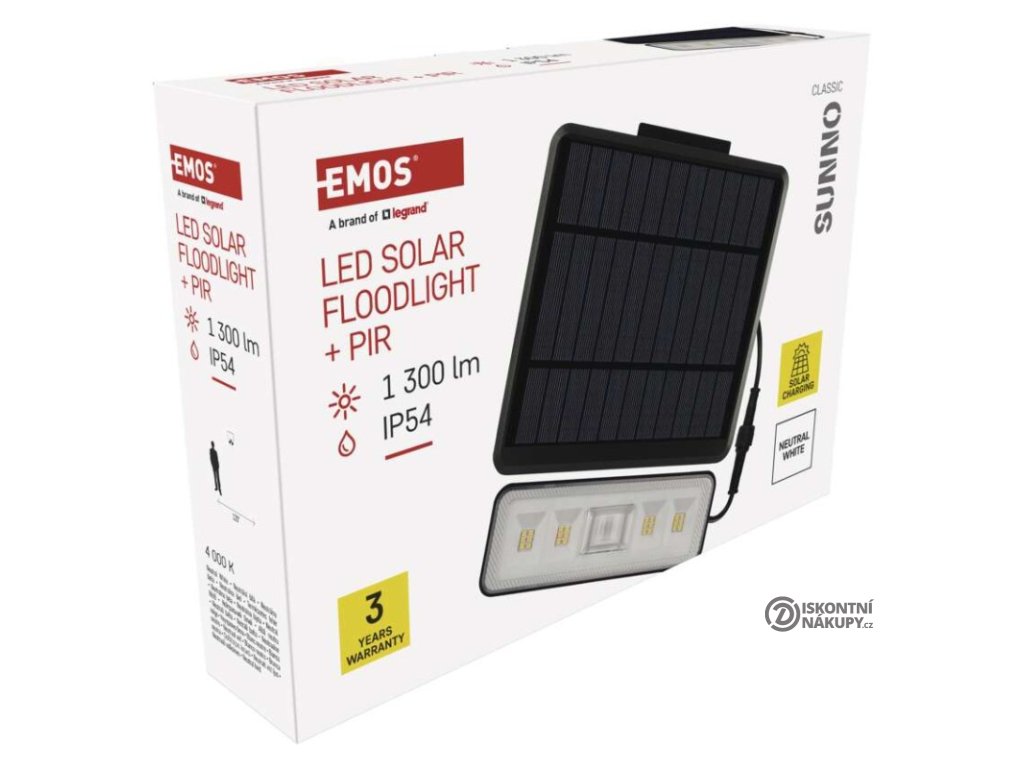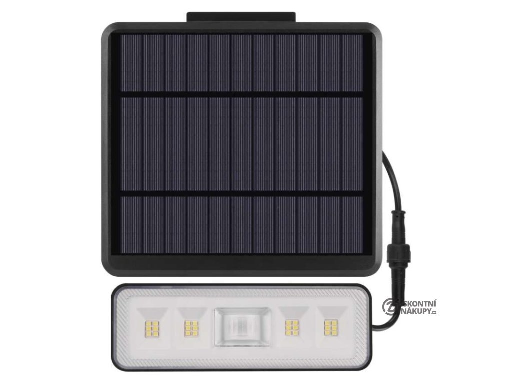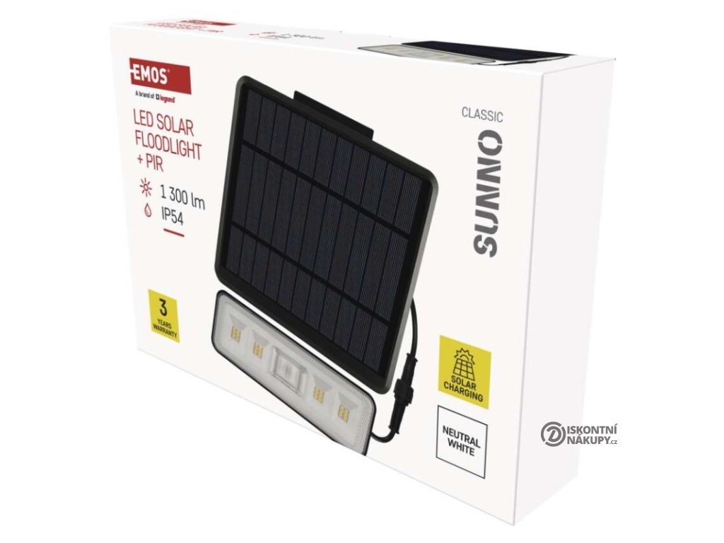 akumulátor: Li-Ion 2 500 mAh|barva: černá|barva světla: neutrální bílá|délka přívodního kabelu: 1,8 m|doba svícení na AKU: neuvádí se|dosah PIR senzoru: 6 m|energetická třída použitého světelného zdroje: neuvádí se|flicker-free: nebliká|frekvence: neuvádí se|index podání barev (CRI): Ra > 80|kategorie: CLASSIC|krytí: IP54|materiál difuzoru: plast (PC)|materiál přívodního kabelu: neuvádí se|materiál těla: plast (ABS+PC)|napájení: solární|napětí: 3,7 V|PIR senzor: ano|počet průchozích zásuvek: neuvádí se|použití: povrchová montáž|příkon: –|prodejní obal: 1 ks, krabice|proud: neuvádí se|řada: neuvádí se|rozměr: 181 × 180 × 70 mm|rozsah pracovní teploty: -10 °C až +40 °C|stmívání: neuvádí se|stupeň ochrany proti mechanickým nárazům: neuvádí se|světelná účinnost: neuvádí se|světelný tok: 1 300 lm|teplota chromatičnosti: 4 000 K|typ přívodního kabelu: neuvádí se|typ průchozích zásuvek: neuvádí se|typ stmívání: –|účiník: neuvádí se|úhel vyzařování: 100°|záruční doba: 3 roky|zdroj světla: LED|životnost: neuvádí se|zkušební žárovka součástí balení: neDoplňkové parametry