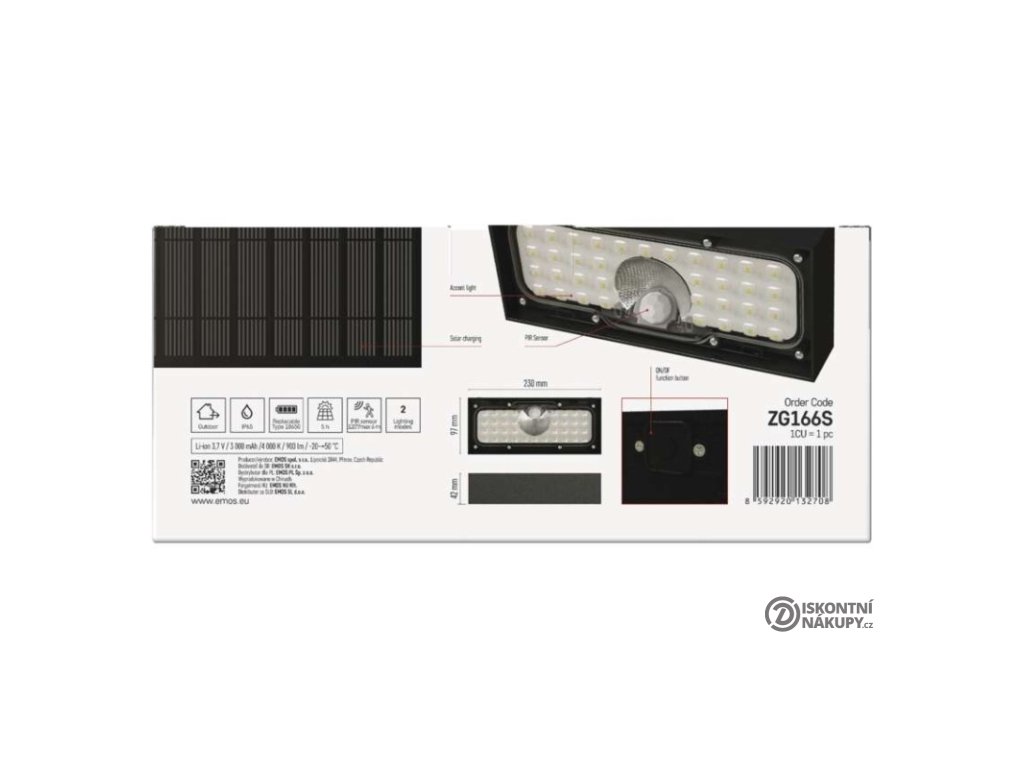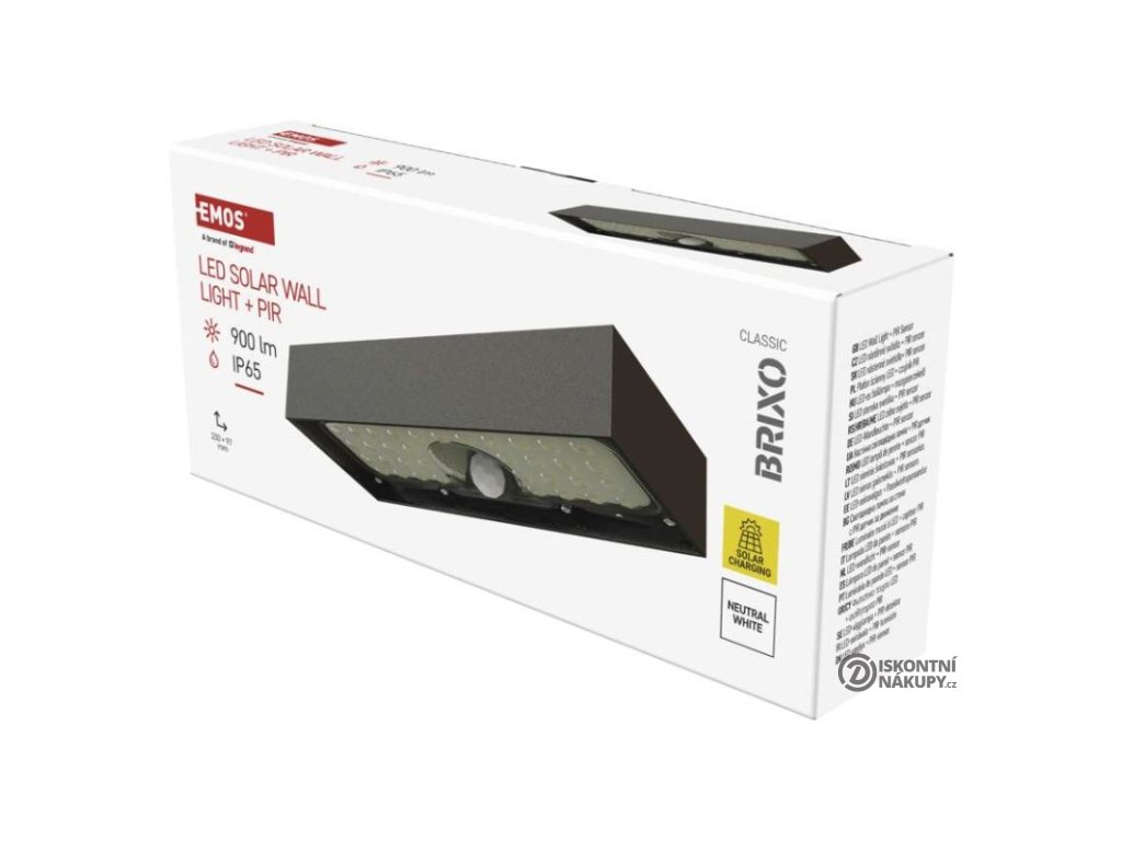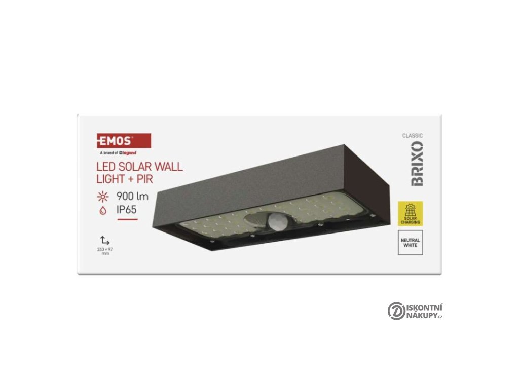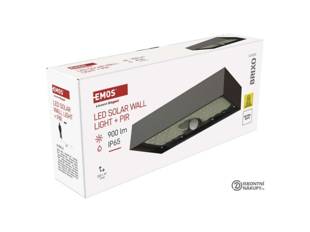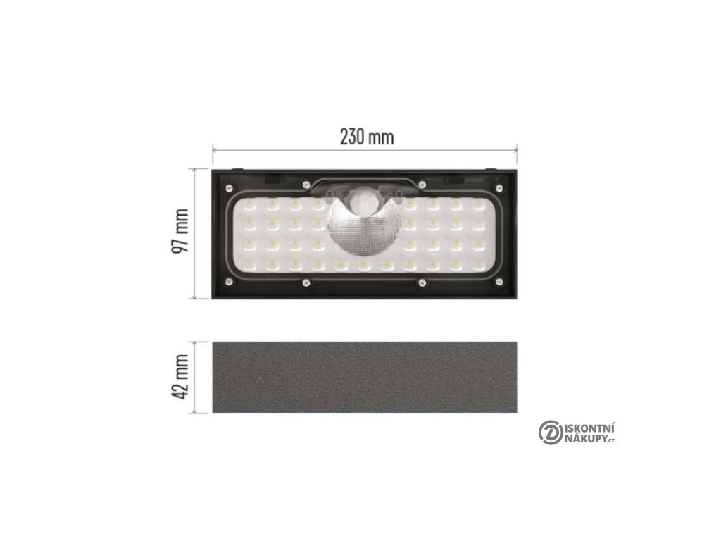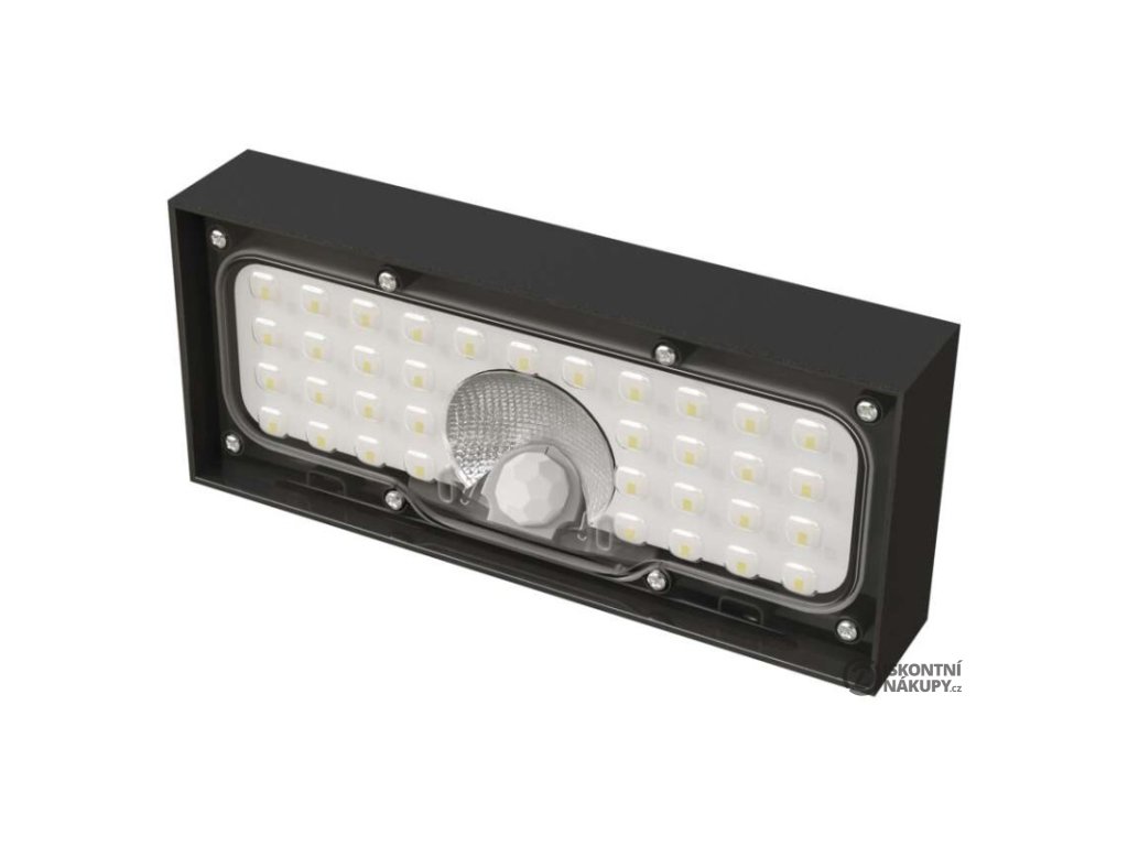 akumulátor: Li-Ion 3 000 mAh|barva: černá|barva světla: neutrální bílá|délka přívodního kabelu: neuvádí se|doba svícení na AKU: 35 hodin|dosah PIR senzoru: 7 m|energetická třída použitého světelného zdroje: neuvádí se|flicker-free: nebliká|frekvence: neuvádí se|index podání barev (CRI): Ra > 80|kategorie: CLASSIC|krytí: IP65|materiál difuzoru: plast (PC)|materiál přívodního kabelu: neuvádí se|materiál těla: plast (ABS+PC)|napájení: solární|napětí: 3,7 V|PIR senzor: ano|počet průchozích zásuvek: neuvádí se|použití: povrchová montáž|příkon: –|prodejní obal: 1 ks, krabice|proud: neuvádí se|řada: neuvádí se|rozměr: 230 × 97 × 43 mm|rozsah pracovní teploty: -20 °C až +50 °C|stmívání: neuvádí se|stupeň ochrany proti mechanickým nárazům: neuvádí se|světelná účinnost: neuvádí se|světelný tok: 900 lm|teplota chromatičnosti: 4 000 K|typ přívodního kabelu: neuvádí se|typ průchozích zásuvek: neuvádí se|typ stmívání: –|účiník: neuvádí se|úhel vyzařování: 140° × 70°|záruční doba: 2 roky|zdroj světla: LED|životnost: neuvádí se|zkušební žárovka součástí balení: neuvádí seDoplňkové parametry