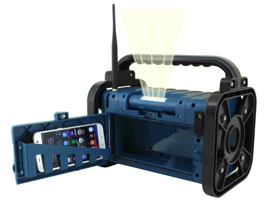 Robustní venkovní rádio vybavené moderním příjmem DAB+ rádiových stanic v kombinaci s klasickým FM tunerem. Rádio disponuje jak vstupem AUX pro drátové přehrávání, tak i bezdrátovým připojením Bluetooth pro přehrávání z chytrého telefonu, který je navíc možné schovat do vnitřní přihrádky. Samozřejmostí je voděodolnost a prachuvzdornost díky certifikaci IP44. Potěší také vestavěné LED osvětlení. O napájení se stará integrovaná baterie s kapacitou 2000 mAh, která zaručuje dlouhé hodiny nerušeného poslechu.