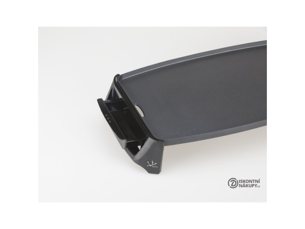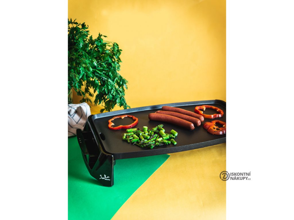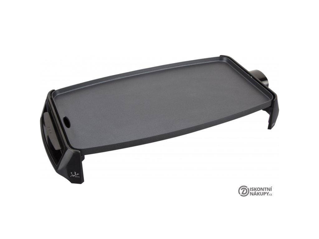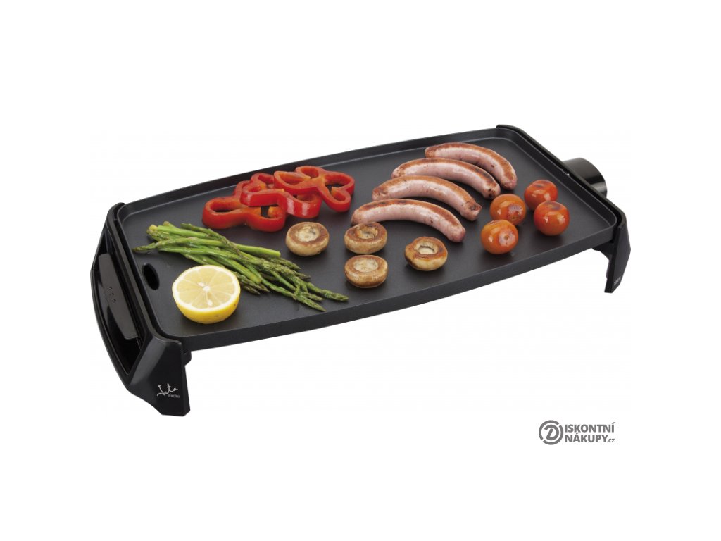 Stolní gril Jata GR195. Deska o rozměru 46 x 25 cm, povrch Xylan, bez PFOA. Odnímatelný termostat pro nastavení teploty je integrovaný do přívodního kabelu. Nádobka pro zachycení šťávy. Příkon 2200 W