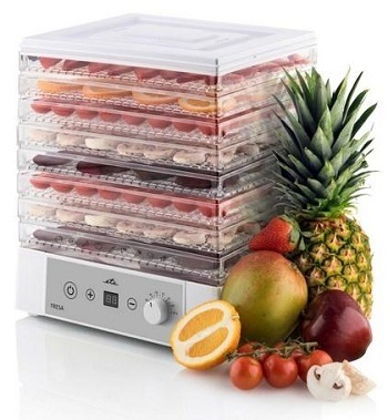Sušička potravin ETA FRESA s příkonem 250 W suší ovoce, zeleninu, houby, ryby, maso a bylinky za pomoci horkého vzduchu. Součástí balení je 8 sušicích sít, na kterých lze sušit různé druhy potravin, počet sušicích sít si můžete zvolit podle množství potravin. Balení obsahuje speciální síto na bylinky. Sušicí síta jsou čirá a usnadňují tak kontrolu procesu sušení. Teplotu sušení si nastavíte v rozsahu 35–70 °C. Samotný chod sušičky je tichý, disponuje přehledným LED displejem a tlačítkem ON/OFF.