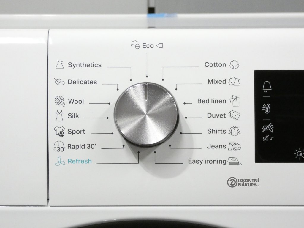 | Výpis programů: | Eco bavlna, Mix, Ložní prádlo, Košile, Sport, Přikrývky, Jeans, Snadné žehlení, Osvěžení, Rychlé 30', Barevné, Hedvábí, Vlna, Jemné prádlo, Syntetika |