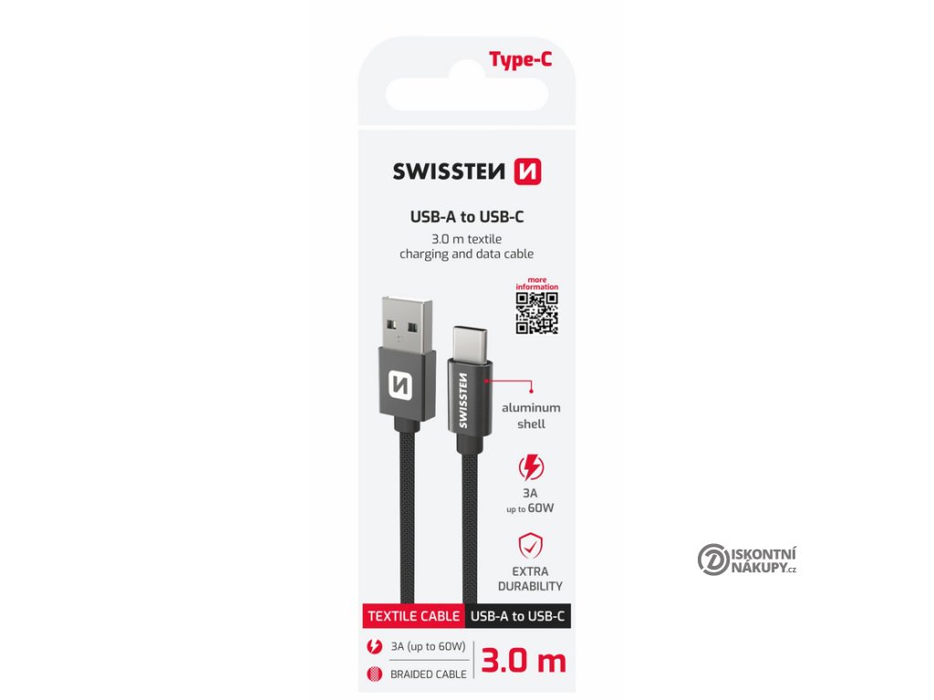 SWISSTEN datový kabel USB-A / USB-C, s textilním opletem, délka 3,0 m