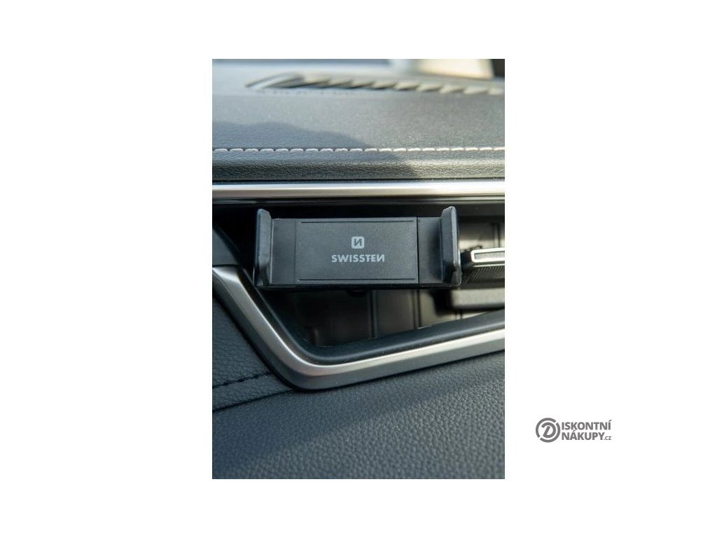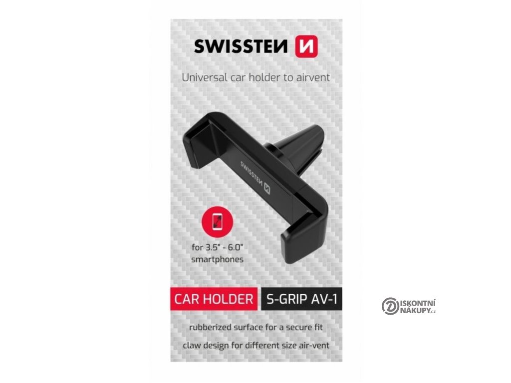 SWISSTEN S-Grip AV-1Univerzální držák telefonu o velikosti od 3,5" do 6" do auta určený k instalaci do mřížky ventilátoru. Drží telefon prostřednictvím velmi silné pružinové klipsy, která je k tělu držáku připevněna prostřednictvím rotačního kloubu umožňujícího manipulaci s telefonem v rozsahu 360°. Umožňuje tak natočení telefonu na výšku i na šířku.