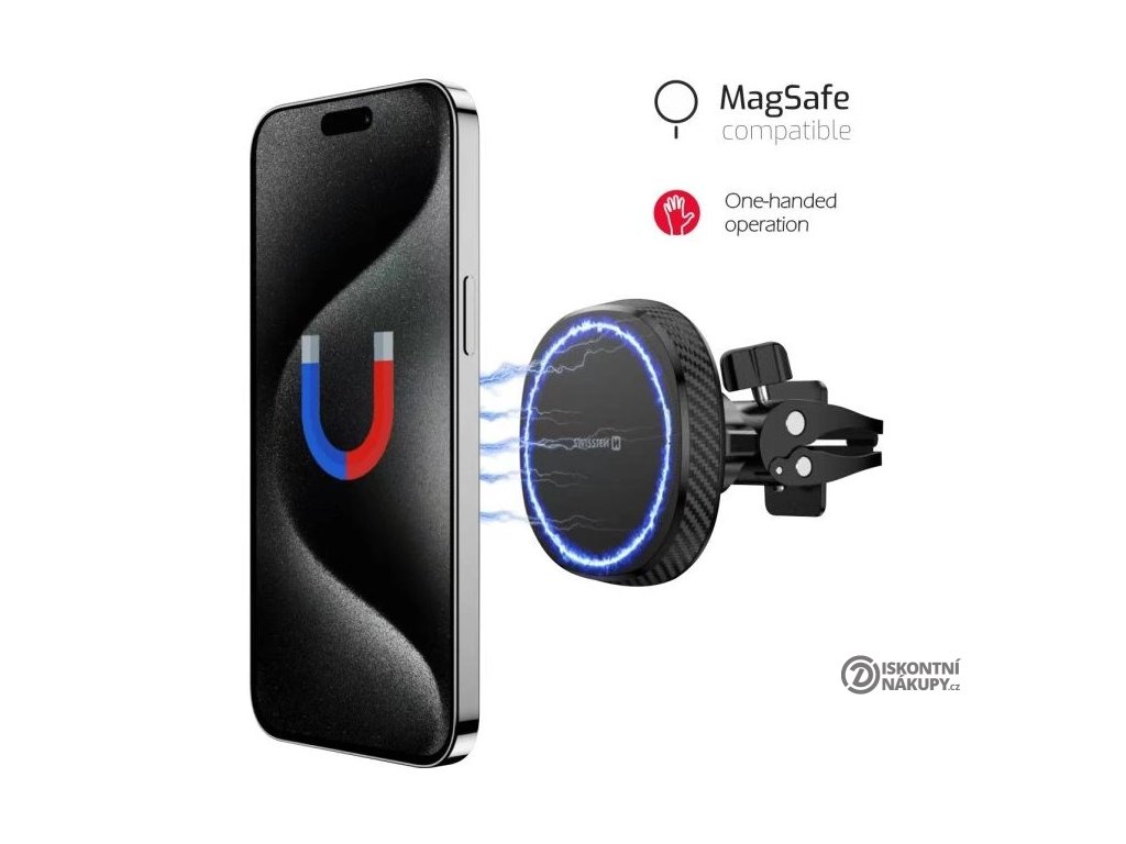 SWISSTEN MagStick CompactMagnetický držák do ventilační mřížky auta s podporou přichycení MagSafe zajistí pevné a bezpečné uchycení iPhonu. Velmi silné čelisti do ventilace se utahují ze zadní strany, tudíž zde nehrozí, že by držák vypadl. Zároveň díky kloubu, který drží magnet si pohodlně nastavíte a zafixujete úhel telefonu.
