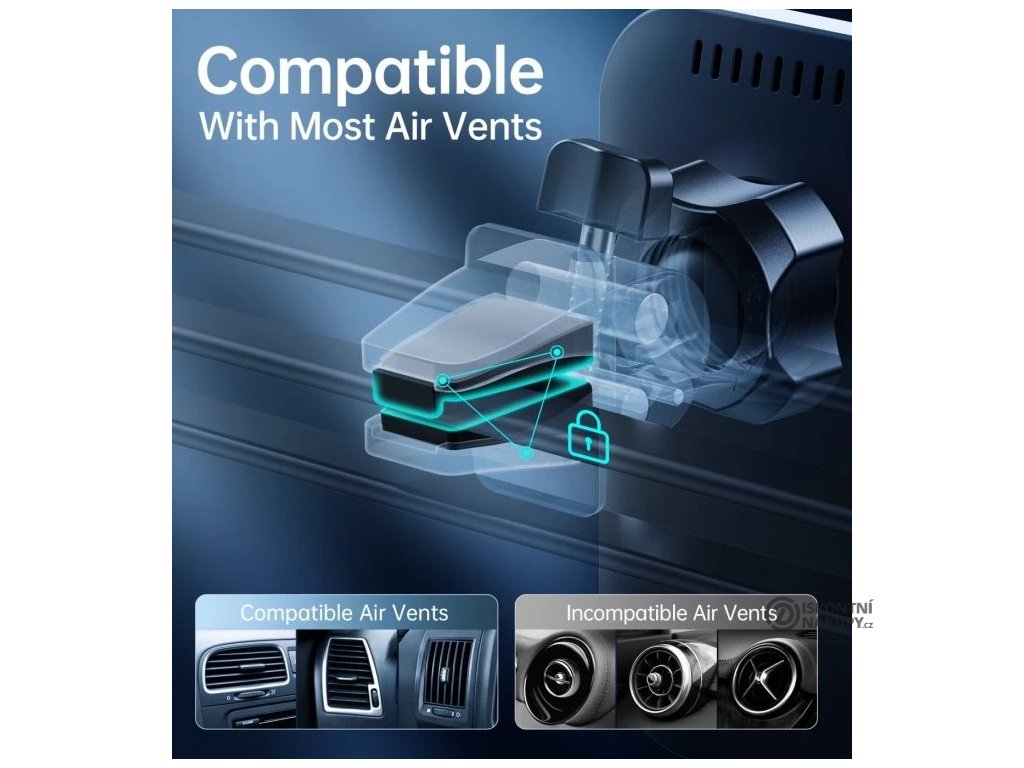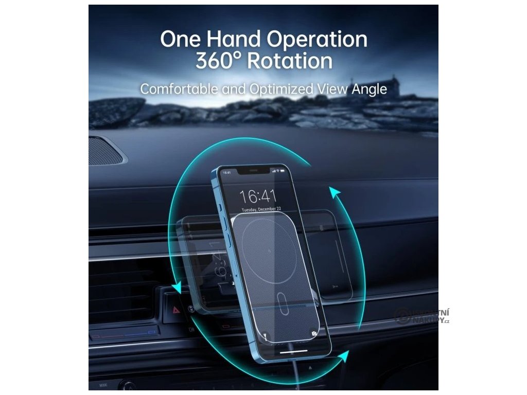 SWISSTEN MagSafe držák do ventilace 15 WMagnetický držák a bezdrátová nabíječka v jednom s uchycením do ventilace auta. Čelisti držáku jsou opatřeny gumou, díky které nedojde k poškození mřížky ventilátoru. Umožňuje bezdrátové MagSafe nabíjení, to je určeno pro majitele iPhone 12 (a vyšších řad), přičemž sada magnetů dokonale zarovná iPhone s nabíječkou a nabíjení je tak maximálně efektivní. Tento magnetický držák se ale díky kompatibilitě s nabíjením Qi dá používat také k bezdrátovému nabíjení iPhone 8 a novějších modelů – a to s výkonem až 15 W. Vhodnou pozici v rozsahu 360° lze navíc zafixovat speciální šroubem na zadní straně držáku.