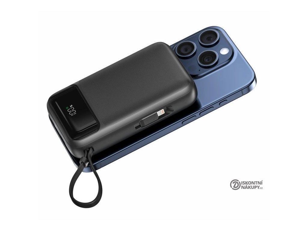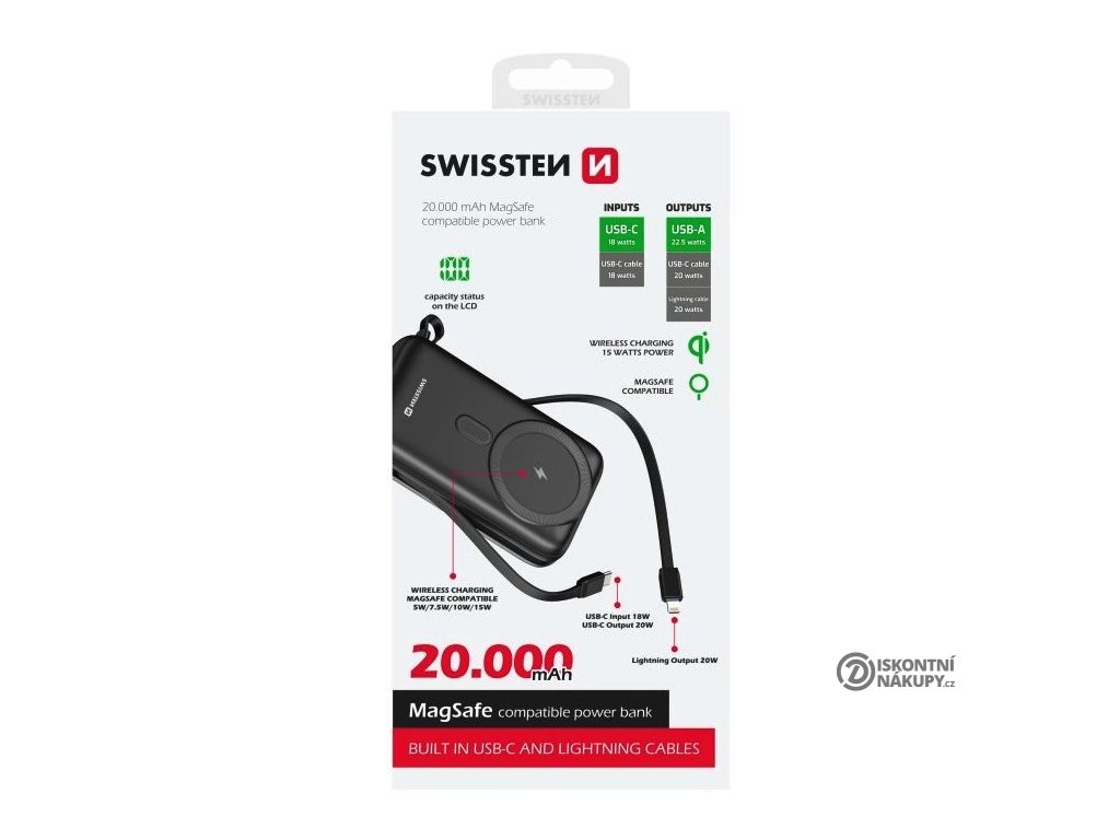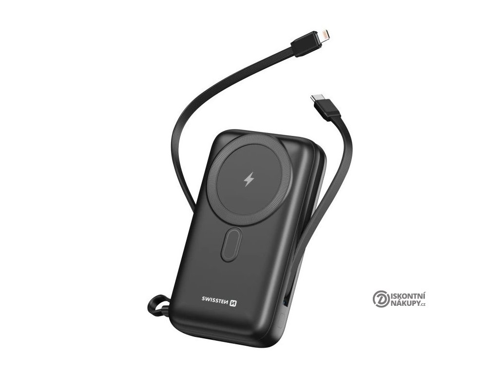 SWISSTEN powerbanka s MagSafe a kabely USB-C/Lightning 20000 mAhPowerbanka s kapacitou 20 000 mAh, se kterou již nebudete muset řešit žádné kabely. Nabízí dva integrované kabely s konektory USB-C a Lightning, a navíc i bezdrátové dobíjení pomocí technologie Qi či MagSafe. Výhodou je, že powerbanka vůči její kapacitě nezabírá velké množství místa (129 × 73 × 30 mm).