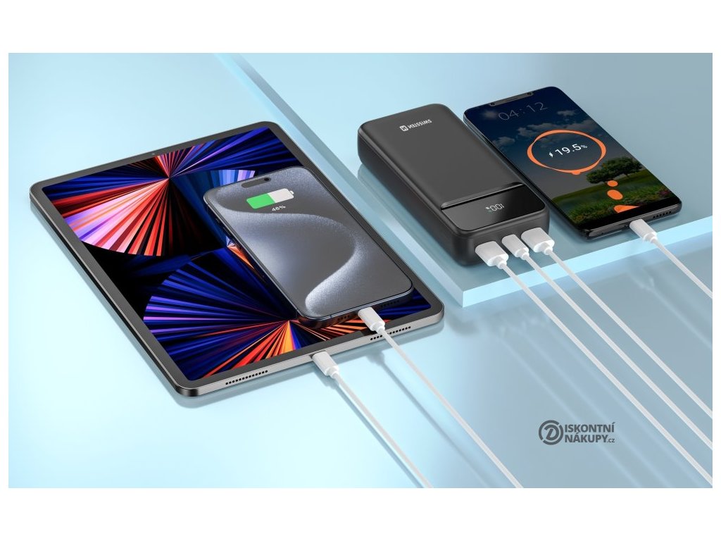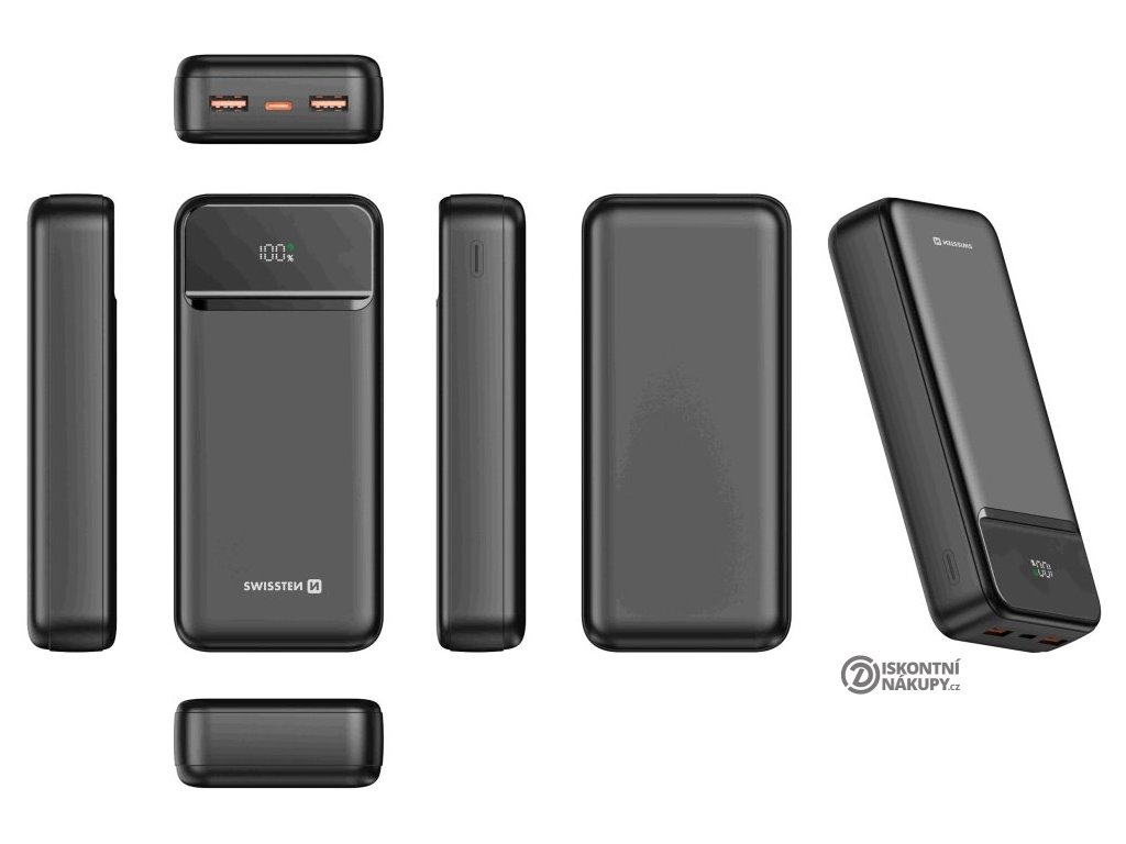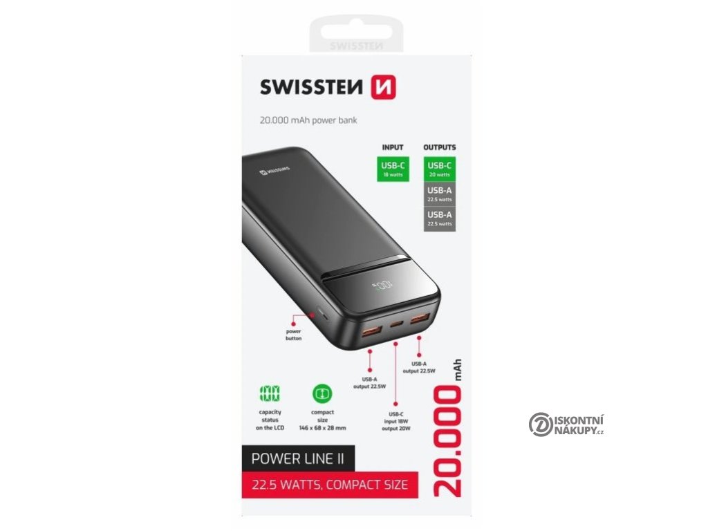 SWISSTEN POWER LINE II 20 000 mAhPowerbanka v elegantním provedení s kapacitou 20 000 mAh nabízí dva USB a jeden USB-C port pro nabíjení až tří zařízení současně. Maximální výstupní výkon až 22,5 W zajišťuje rychlé dobití energie vašich zařízení. Potěší také praktické LED diody zobrazující aktuální stav nabití. Pro nabíjení samotné powerbanky slouží vstupní konektor USB-C. Ohnivzdorný plast, ze kterého je vyrobena, poskytuje maximální bezpečnost.