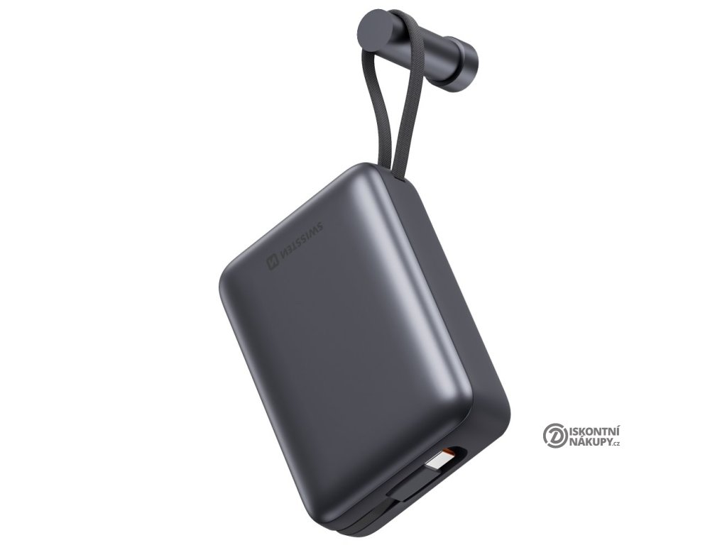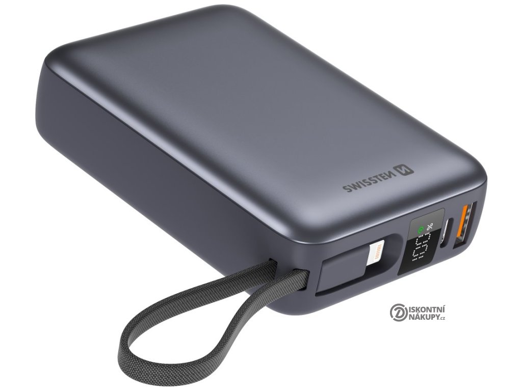 Swissten Power bank 20000 mAh s integrovanými kabely - USB-C, A, Lightning / šedá 22013945