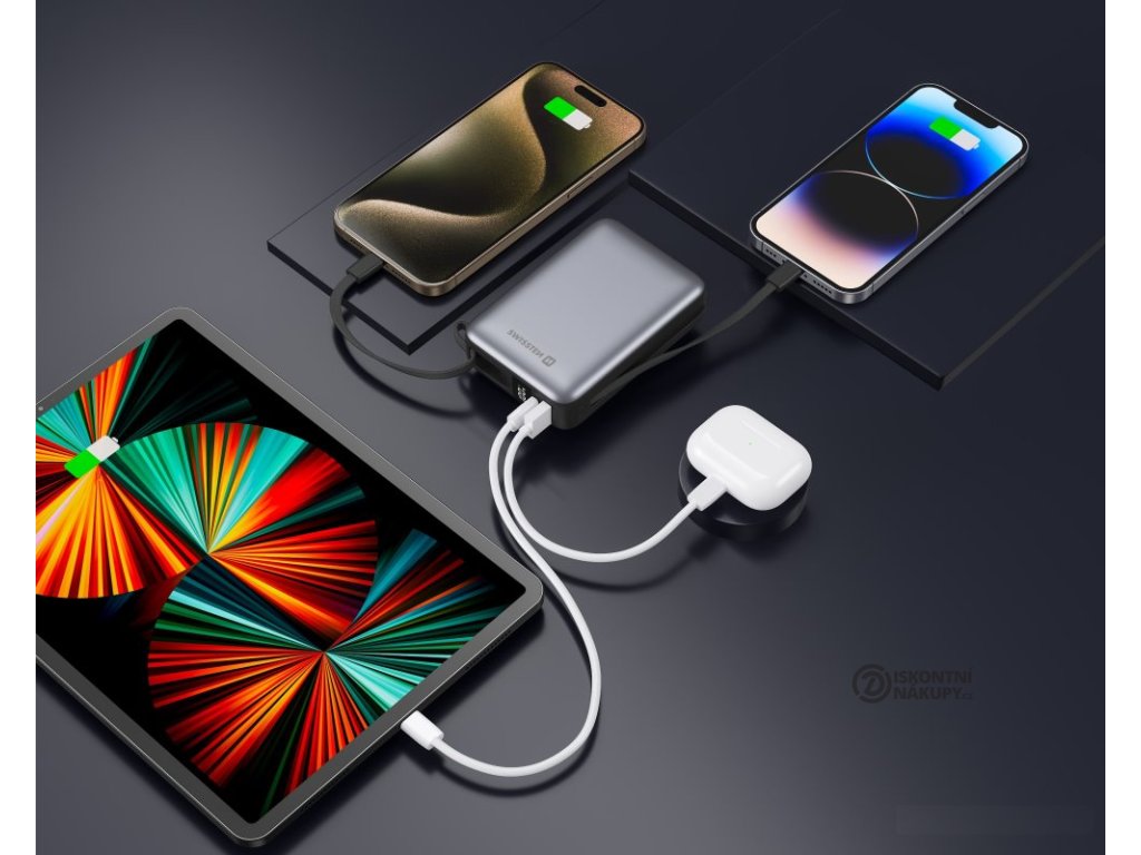 SWISSTEN powerbanka 20000 mAhPowerbanka s kapacitou 20 000 mAh, navržená pro moderní uživatele, kteří potřebují nabíjet více zařízení současně. Nabízí jeden port USB-C, jeden port USB a integrované USB-C a Lightning kabely. Maximální výstupní výkon až 22,5 W umožňuje rychlé nabíjení telefonů a tabletů. Potěší také praktický LCD displej zobrazující aktuální stav nabití. Pro nabíjení samotné powerbanky slouží vstupní konektor USB-C či integrovaný USB-C kabel. Vyrobena je z ohnivzdorného plastu, což výrazně zvyšuje její odolnost a bezpečnost.