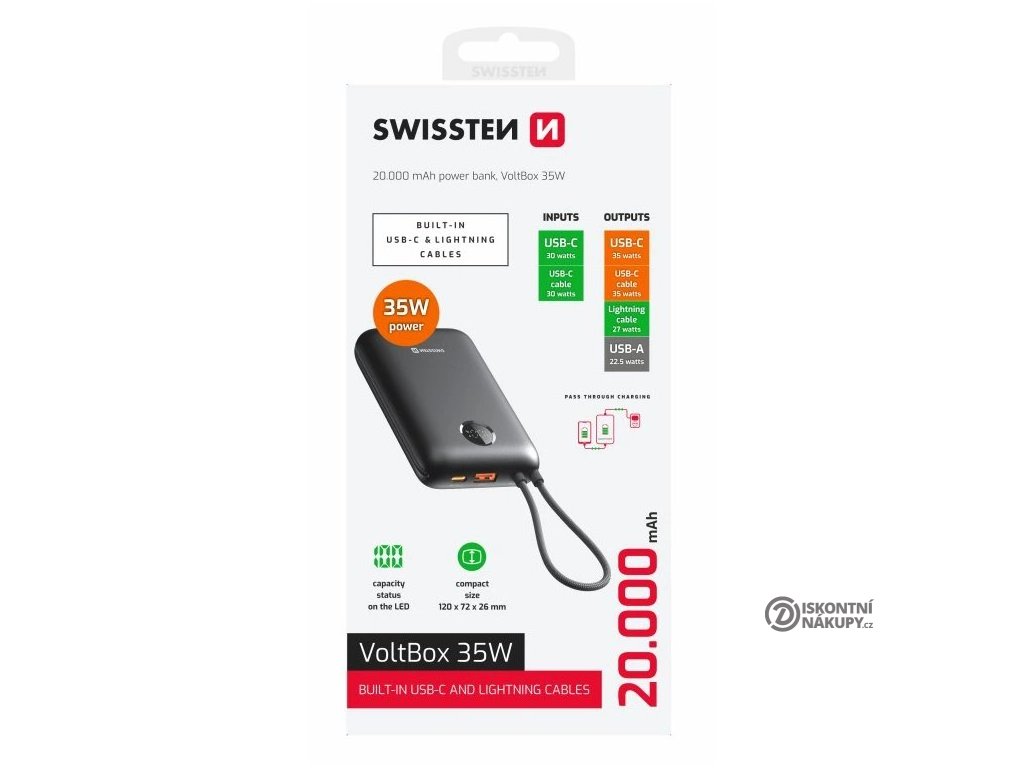Swissten Power bank VOLTBOX 35W 20000 mAh s integrovanými kabely - USB-C, A, Lightning / černá 22013937