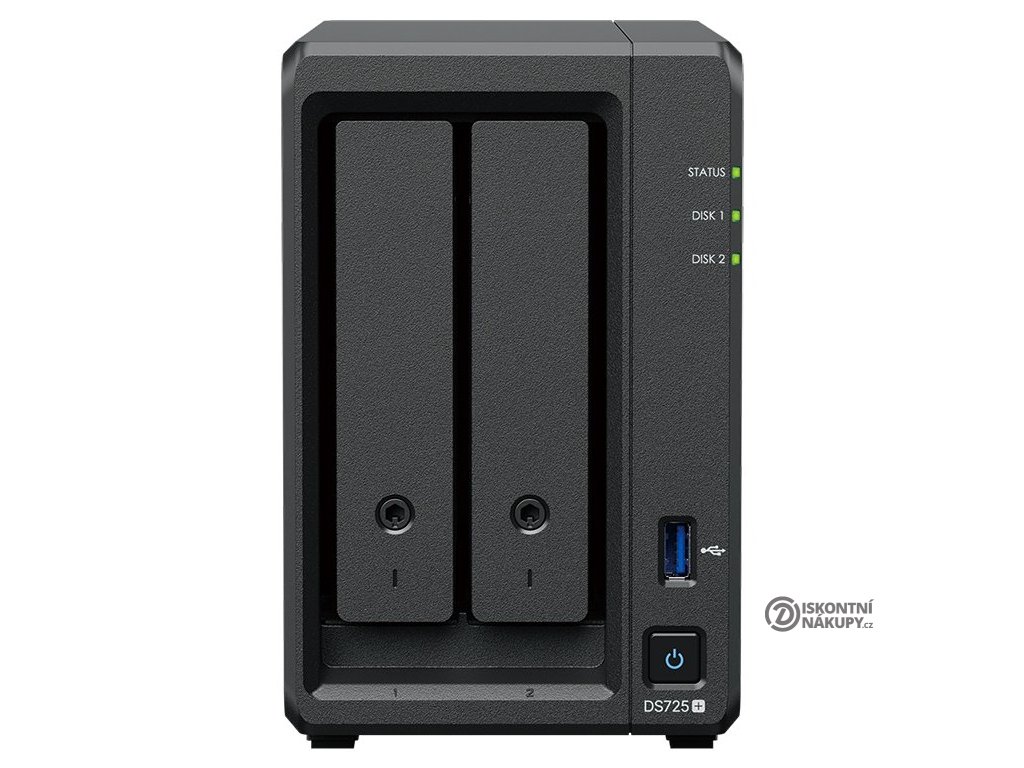 DS725+ nabízí dvě šachty pro 3,5" SATA HDD nebo 2,5" SATA SSD disky s možností výměny za provozu. Navíc obsahuje dva sloty M.2 2280 pro NVMe SSD, které lze využít jako rychlou mezipaměť pro zlepšení výkonu při práci s často používanými daty.