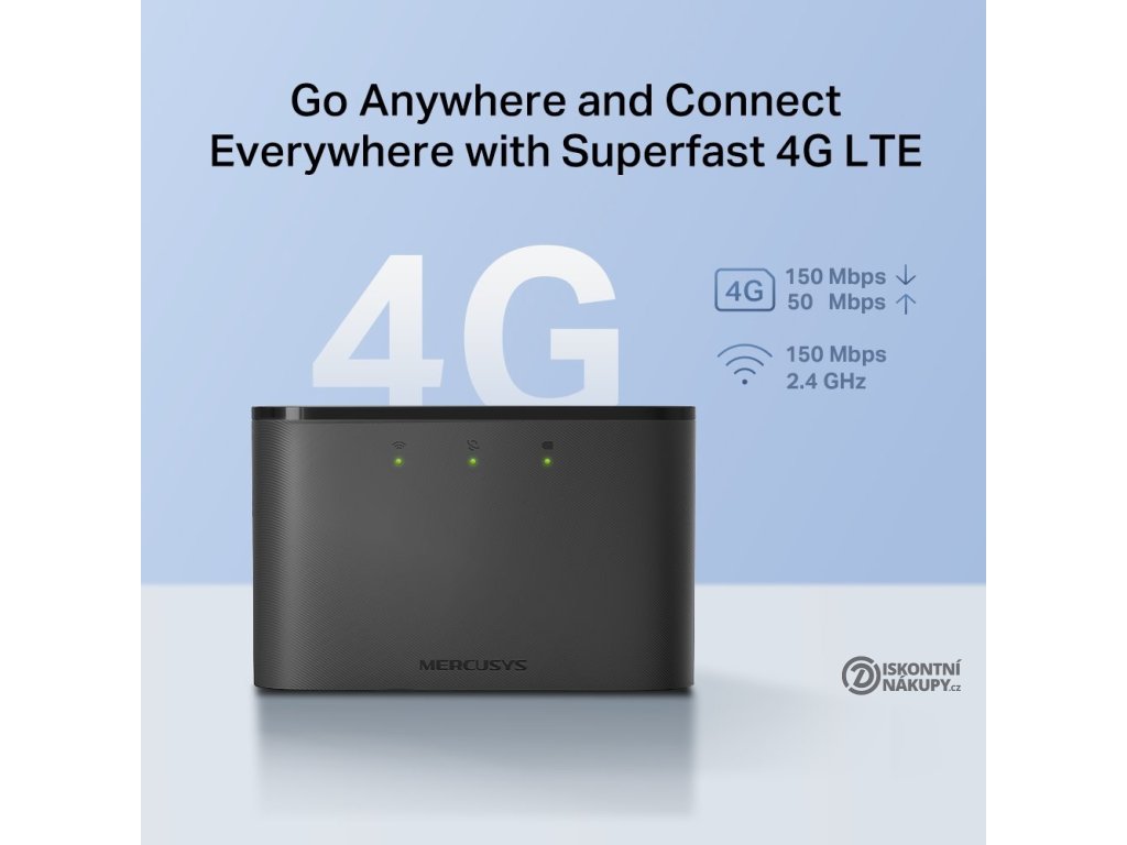 Mercusys MT110LTE router pro sdílení připojení pomocí Wi-Fi. Stačí vložit SIM kartu do zařízení a okamžitě vytvořit Wi-Fi hotspot. Router MT110 dokáže díky rychlosti stahování 150 Mbit/s a uploadu 50 Mbit/s poskytnout možnost sdílení v 4G síti až 10 uživatelům najednou. Díky jeho velikosti a výkonné interní baterii s kapacitou 2200 mAh se z něj stává ideální zařízení na cesty, kdy uživatelům umožní 10 hodin práce či hraní. Součástí balení je micro USB kabel.