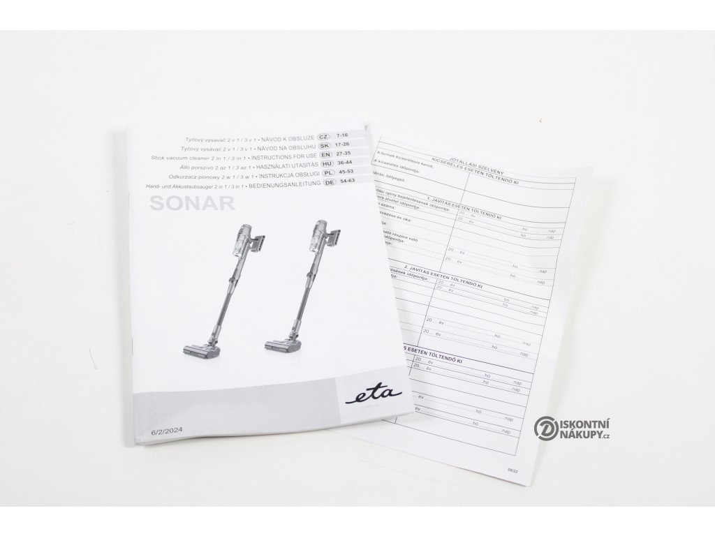 Tyčový vysavač ETA Sonar 2232 90000 šedý ..Odzkoušeno - Vráceno ..Chybí šroubky a hmoždinky ..Kosmetické oděrky ..Záruka 12 měsíců