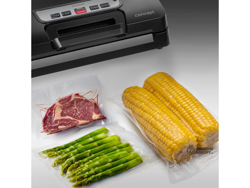 Vakuová svářečka fólií prodlouží životnost vašich potravin. Zamezí přístupu vzduchu, čímž zabraňuje ztrátě důležitých látek obsažených v potravinách a současně uchová jejich čerstvou chuť a aroma. Tímto způsobem skladování potravin zároveň šetříte místo ve vaší lednici i mrazáku. Vakuování můžete využít také při přípravě sous-vide nebo pro urychlení marinace masa. Součástí balení je 10 sáčků a hadička k vakuování potravin v nádobách.