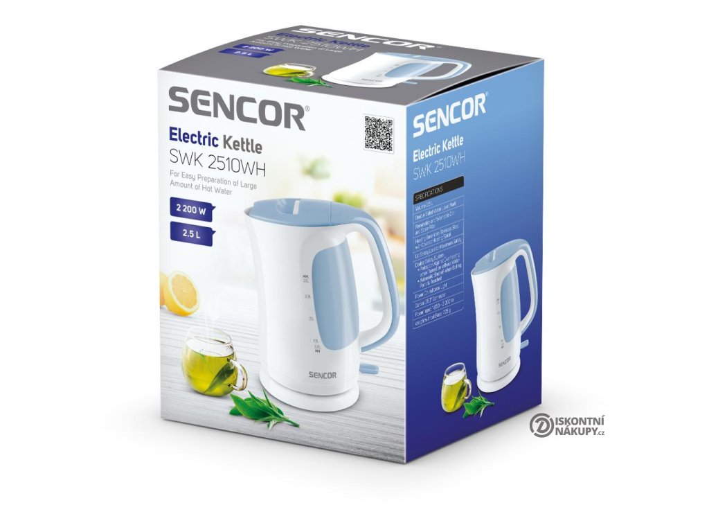 Rychlovarná konvice Sencor SWK 2510WH s oboustranným vodoznakem a příkonem 2 000 W je opatřena objemem 2,5 l. Pohodlnou manipulaci zajišťuje ergonomicky tvarovaná rukojeť a středový 360° konektor. Zařízení obsahuje topné dno z kvalitní nerezové oceli se zakrytou topnou spirálou. Jednoduché ovládání konvice obstarává přepínač (zapnuto/vypnuto).