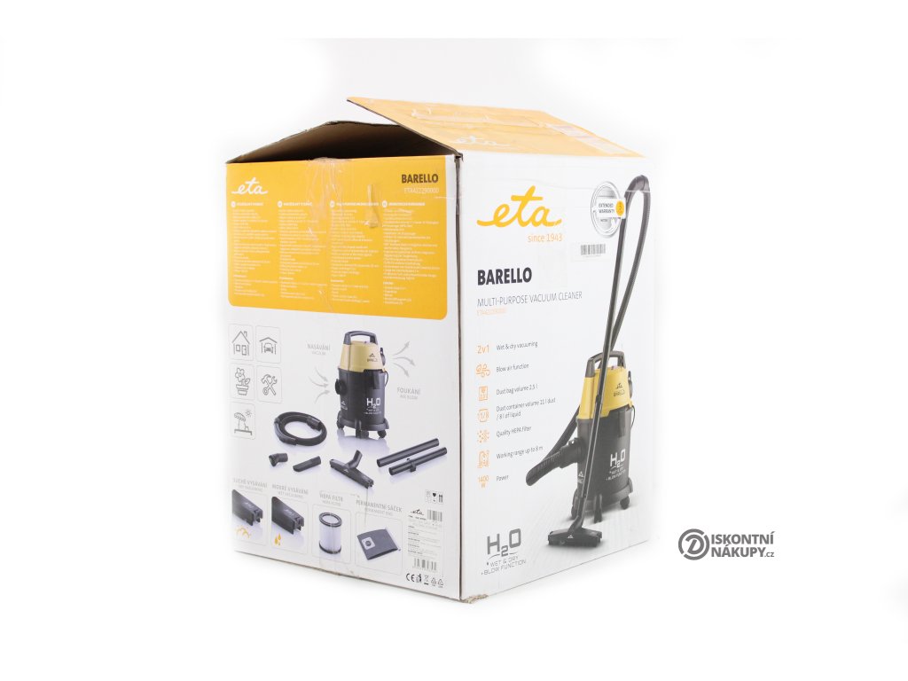 Částice prachu putují do prachového sáčku o objemu 2,5 litru nebo rovnou do velké odpadní nádoby, která jich pojme až 11 litrů. Můžete si tak vybrat, zda bude vysavač ETA Barello sáčkový nebo bezsáčkový. Permanentní textilní sáček umožňuje opakované používání a tím vám šetří náklady. Při vysávání na mokro pojme nádoba až 8 litrů nečistot. Bezpečnostní plovák upozorní na plnou kapacitu. Kromě suchého a mokrého vysávání nabízí vysavač i funkci foukání vzduchu.
