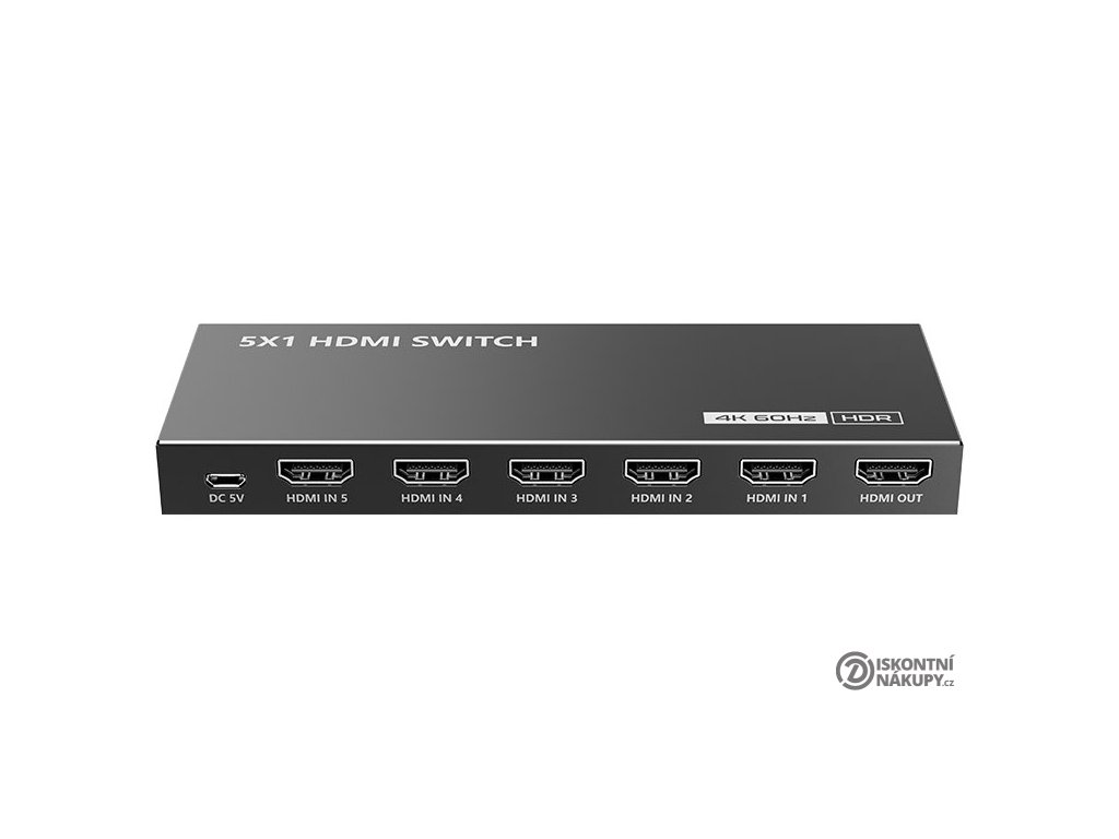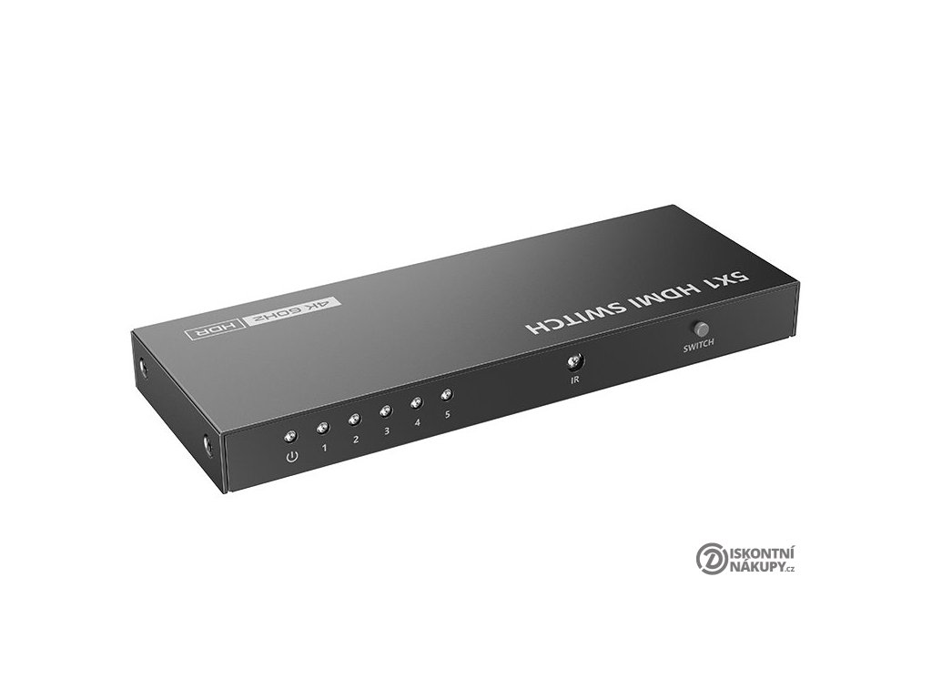 XtendLan HDMI-SW51EHHDMI přepínač z pěti vstupů na jeden výstup. Max. rozlišení 4K × 2K, HDMI 1.4a, dálkový ovladač, napájení 5 V, LED indikace vstupů.
