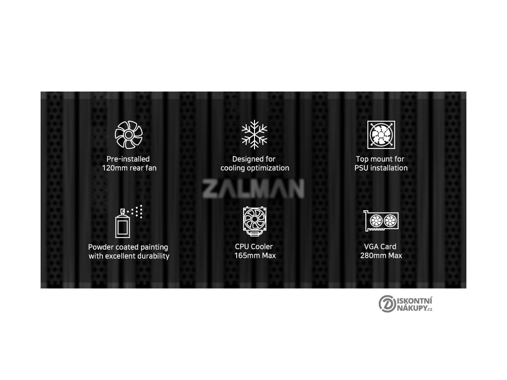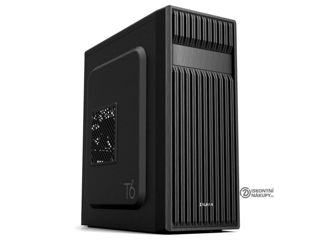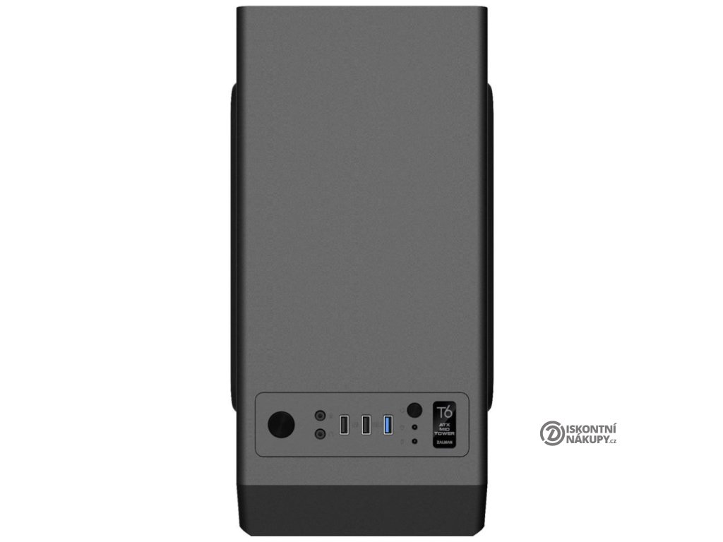 ZALMAN T6Počítačová skříň v provedení Middle tower nabízí dvě 3,5" a dvě 2,5" pozice pro pevné a SSD disky. Z externích pozic je k dispozici jedna 5,25" pozice. Na horním panelu jsou umístěny dva USB 2.0 porty, jeden USB 2.0 port, sluchátkový výstup a vstup pro mikrofon. Skříň je osazena jedním ventilátorem o velikosti 120 mm. Ve skříni je dostatek prostoru pro chladič CPU do výšky až 165 mm a grafickou kartu o délce až 280 mm. Skříň je dodávána bez zdroje.